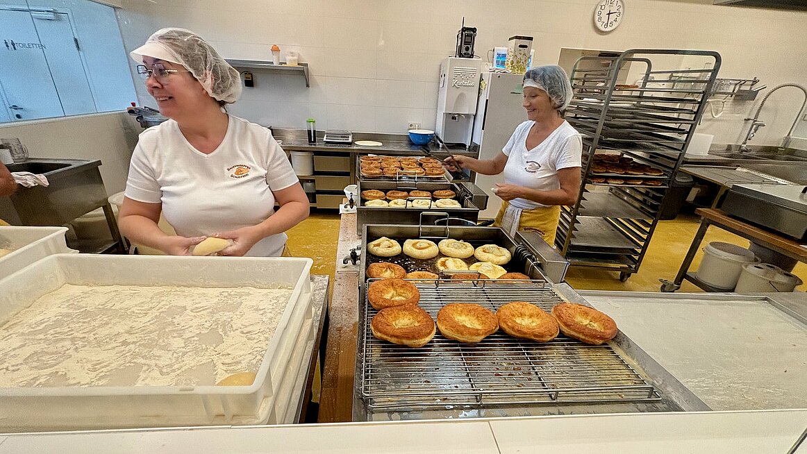 Die Juniorchefin selbst führte uns durch die Tätigkeiten in der Schaubackstube und erzählte mit Begeisterung, wie das Krapfenbacken in der Familie begann und sich über die Jahre entwickelte. Wir konnten den Bäckerinnen und Bäckern direkt beim Schleifen und Backen zusehen – alles echte Handarbeit, „wie eh und je“.