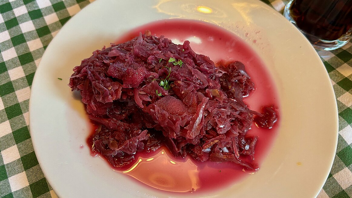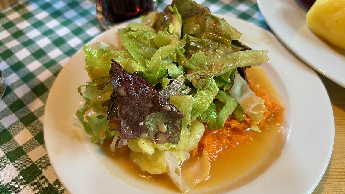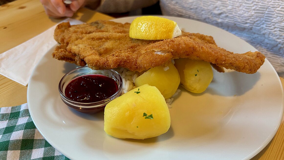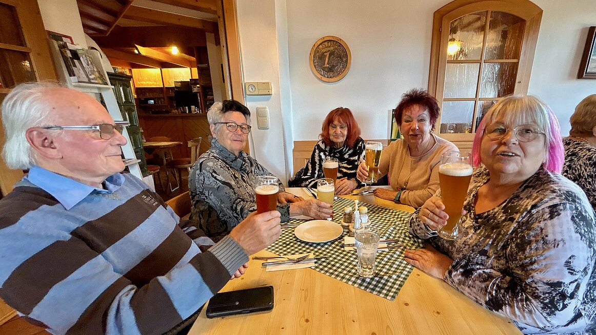 Nach dem eher ruhigen Vormittag brachte uns der Bus nach Rading ins Gasthaus „Schwedenschanze“. Der Name bezieht sich auf die historische Befestigungsanlage aus dem Dreißigjährigen Krieg, die hier zum Schutz vor dem Schwedenheer errichtet worden war. Heute erinnern ein Gedenkstein, zwei hölzerne Kanonen und Infotafeln daran. Mittlerweile dient die Gegend allerdings weniger der Verteidigung, sondern vielmehr der Stärkung – und zwar der kulinarischen Art.