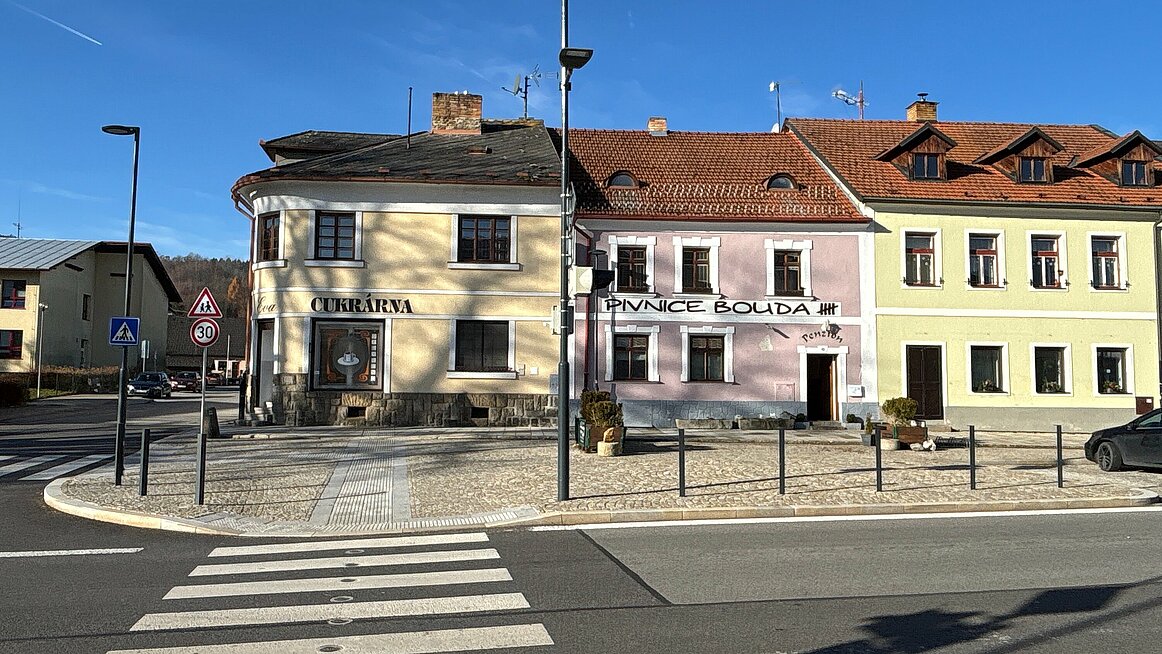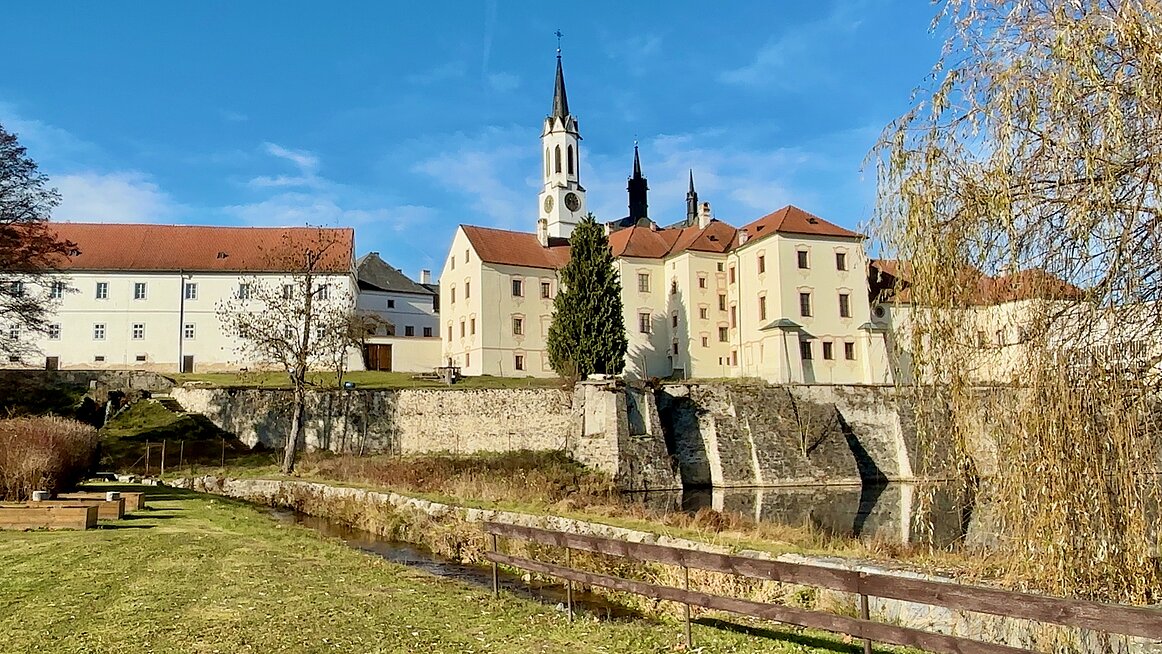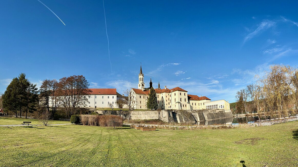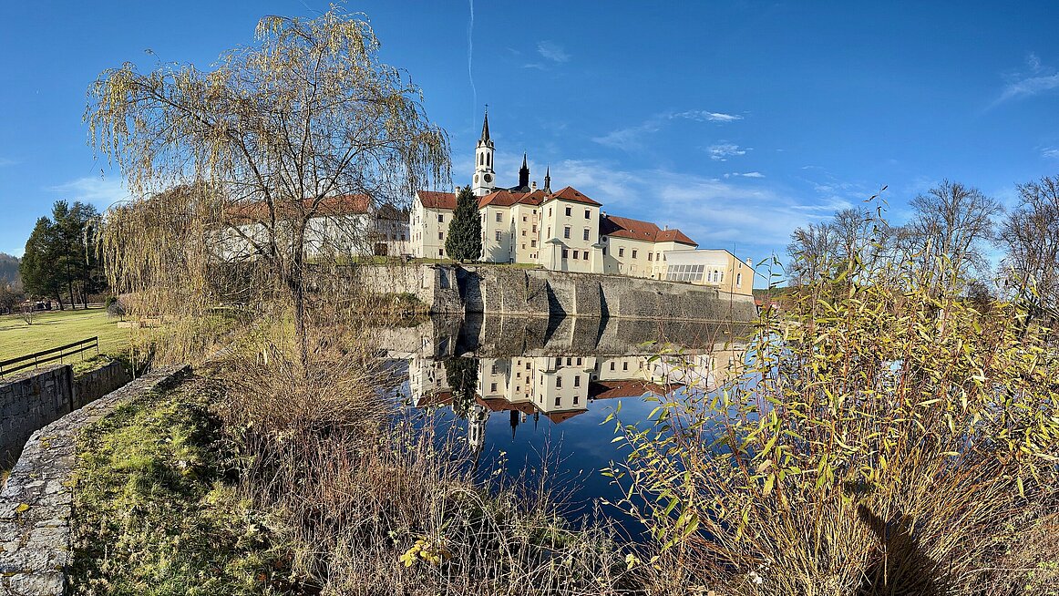 Es war ein frischer Novembermorgen, als wir uns beim Doppl:Punkt versammelten und pünktlich um 9:00 Uhr zur Fahrt über die nördliche Grenze aufbrachen. Nach einer gemütlichen, rund einstündigen Busfahrt erreichten wir Vyšší Brod, eine kleine Stadt an der Moldau, die laut den Informationsbroschüren „als Schatztruhe von Kultur- und Naturschönheiten“ bezeichnet wird. Für uns fühlte es sich allerdings eher wie eine Schatztruhe voller Billigshops an – zumindest im Bereich, den wir zu sehen bekamen.