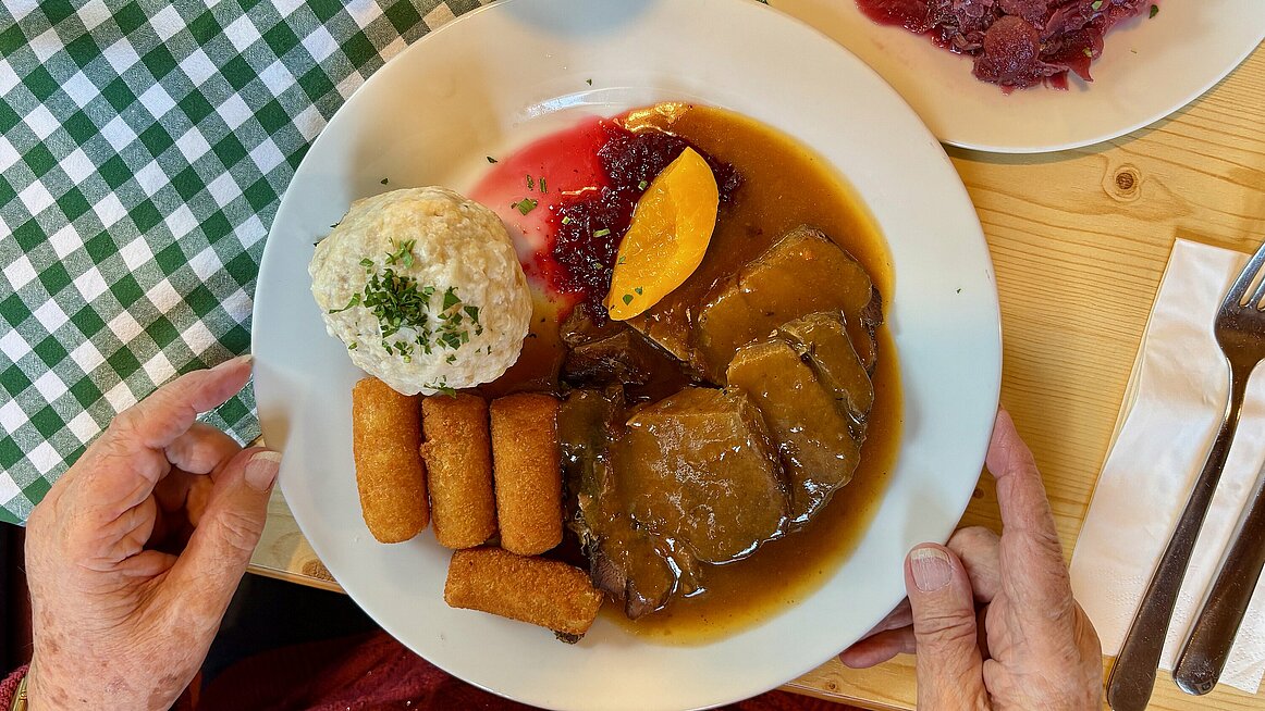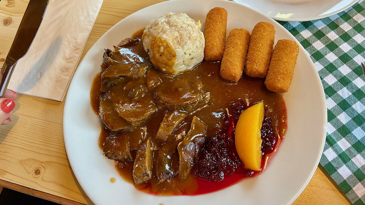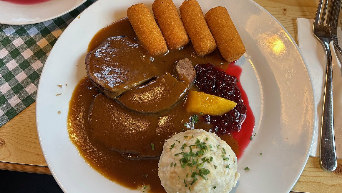Die schöne Speisekarte bot Wildgerichte und andere regionale Spezialitäten, und das vorbestellte Essen wurde tischweise serviert, sodass wir gemeinsam genießen konnten. Die Speisen waren ausgezeichnet und die Zufriedenheit entsprechend hoch – ein klarer Höhepunkt des Tages!