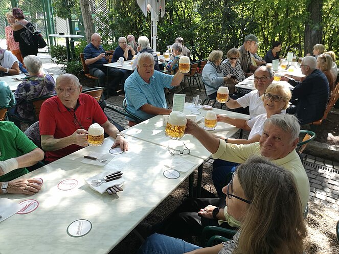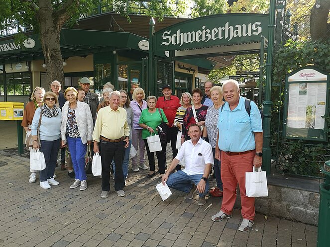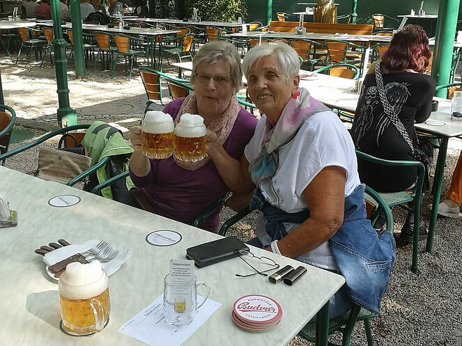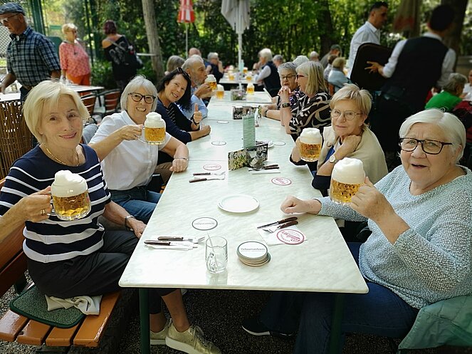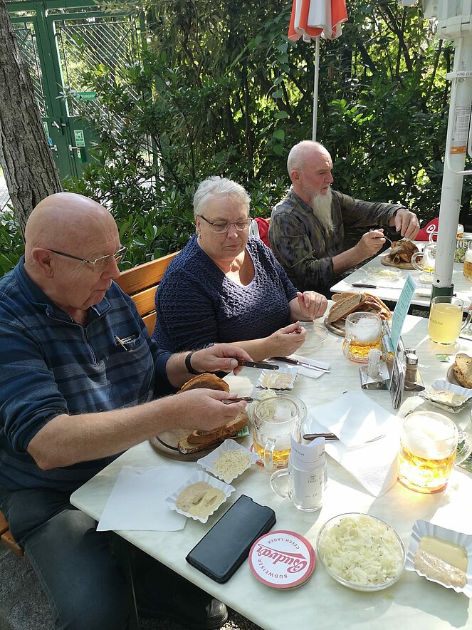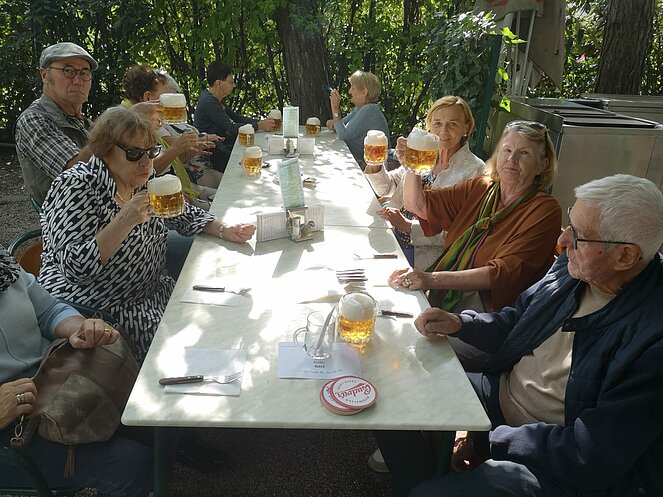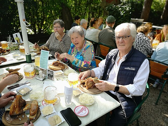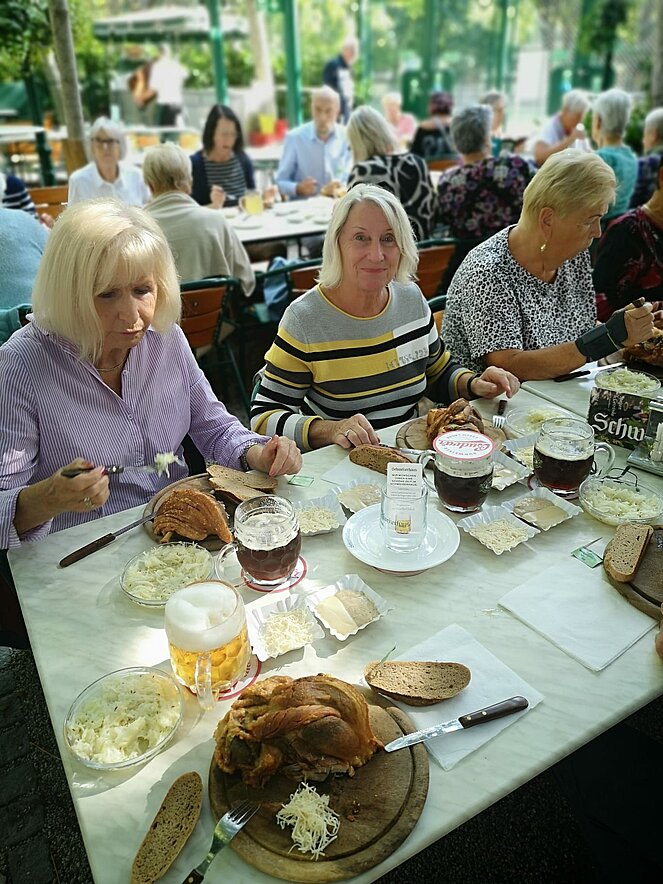Um 13:30 Uhr fand ein Fototermin vor dem Parlament statt, bevor wir unsere Reise in den Prater fortsetzten. Im Schweizerhaus genossen wir bei sonnigem Wetter im Gastgarten knusprige Stelzen mit Kraut, Senf und Kren sowie eine frische Halbe Budweiser.