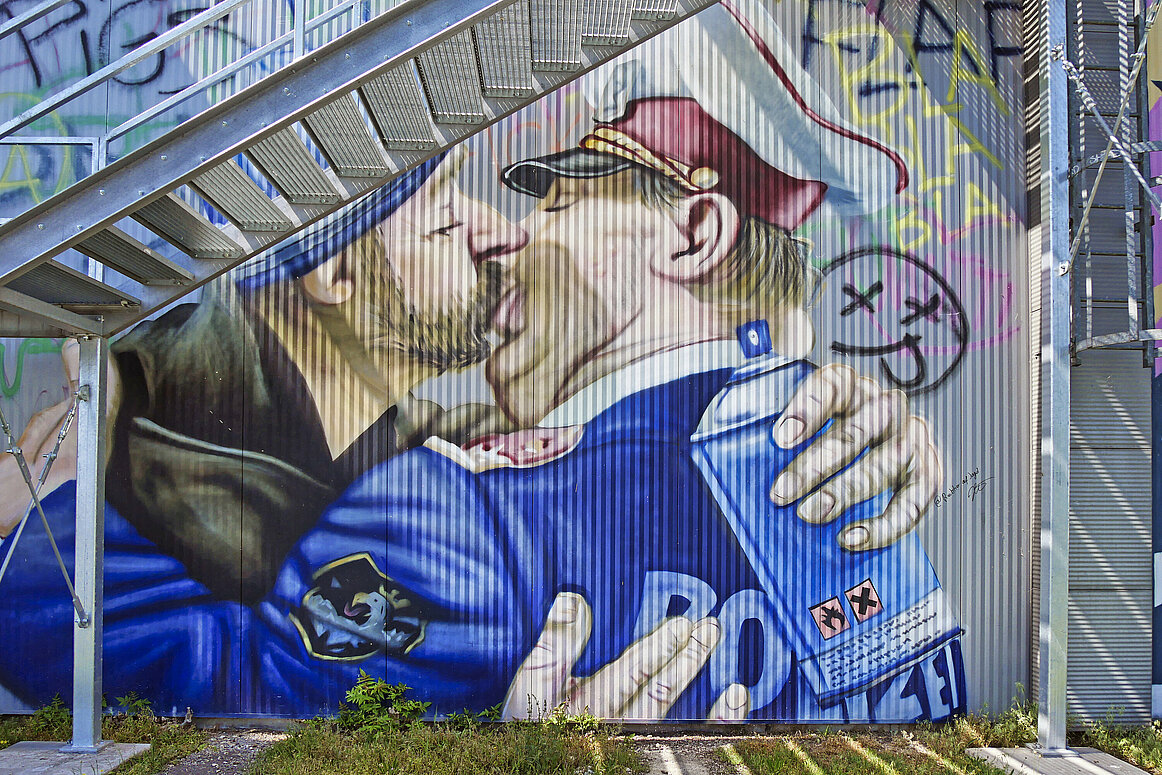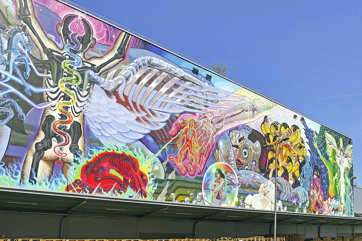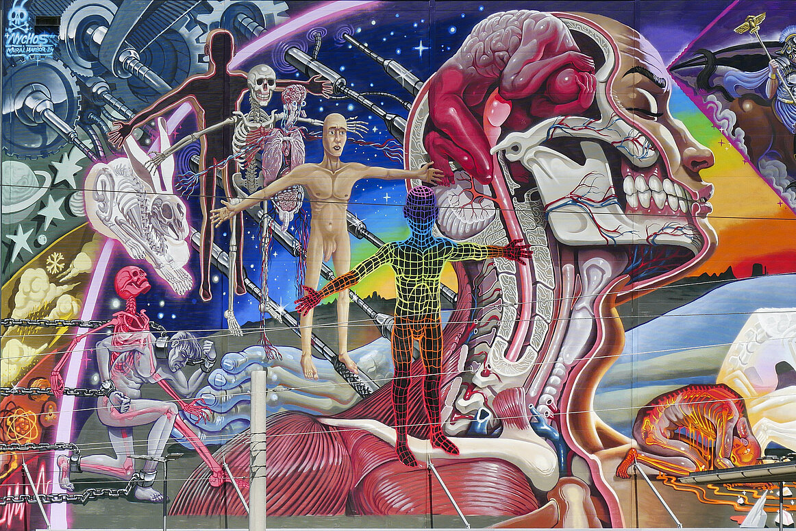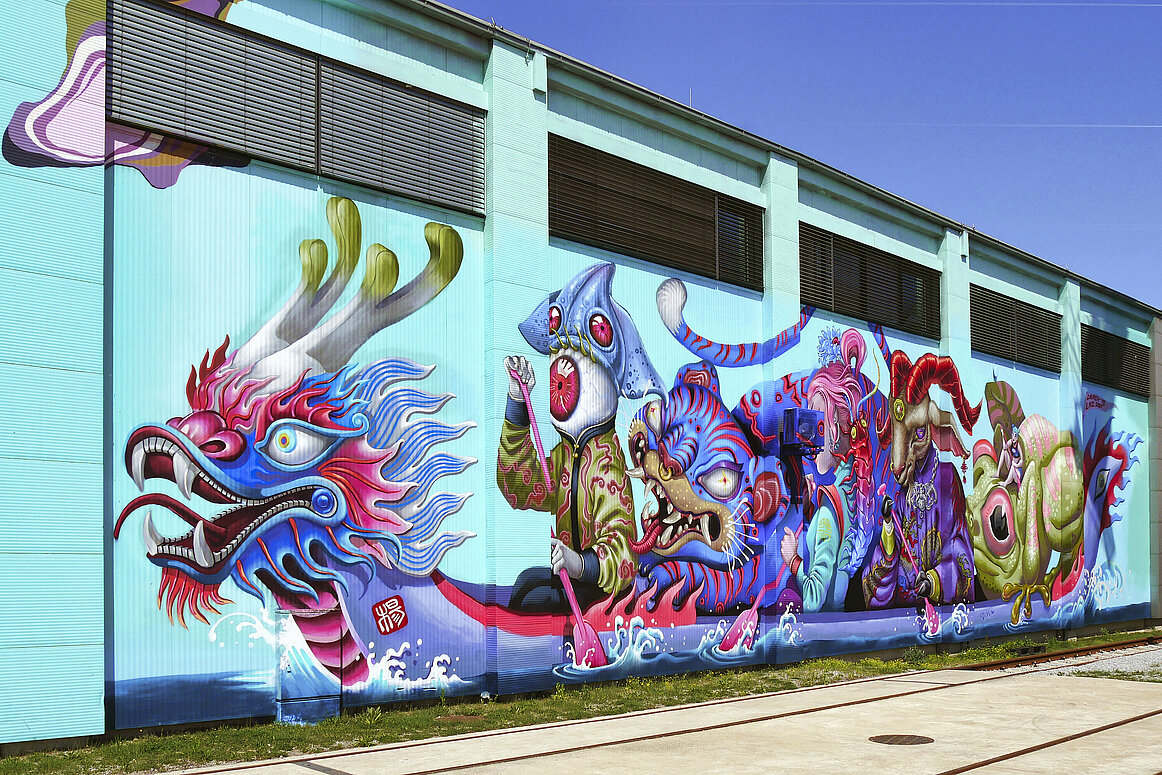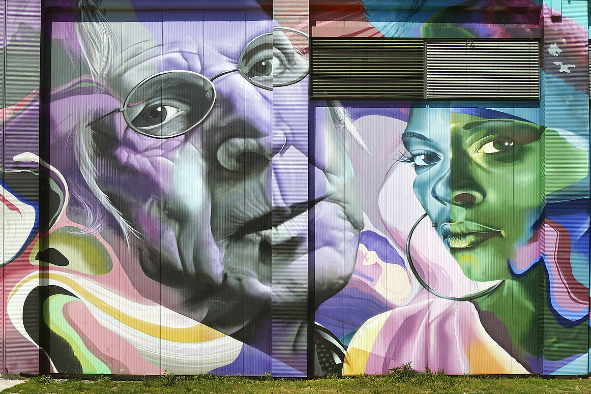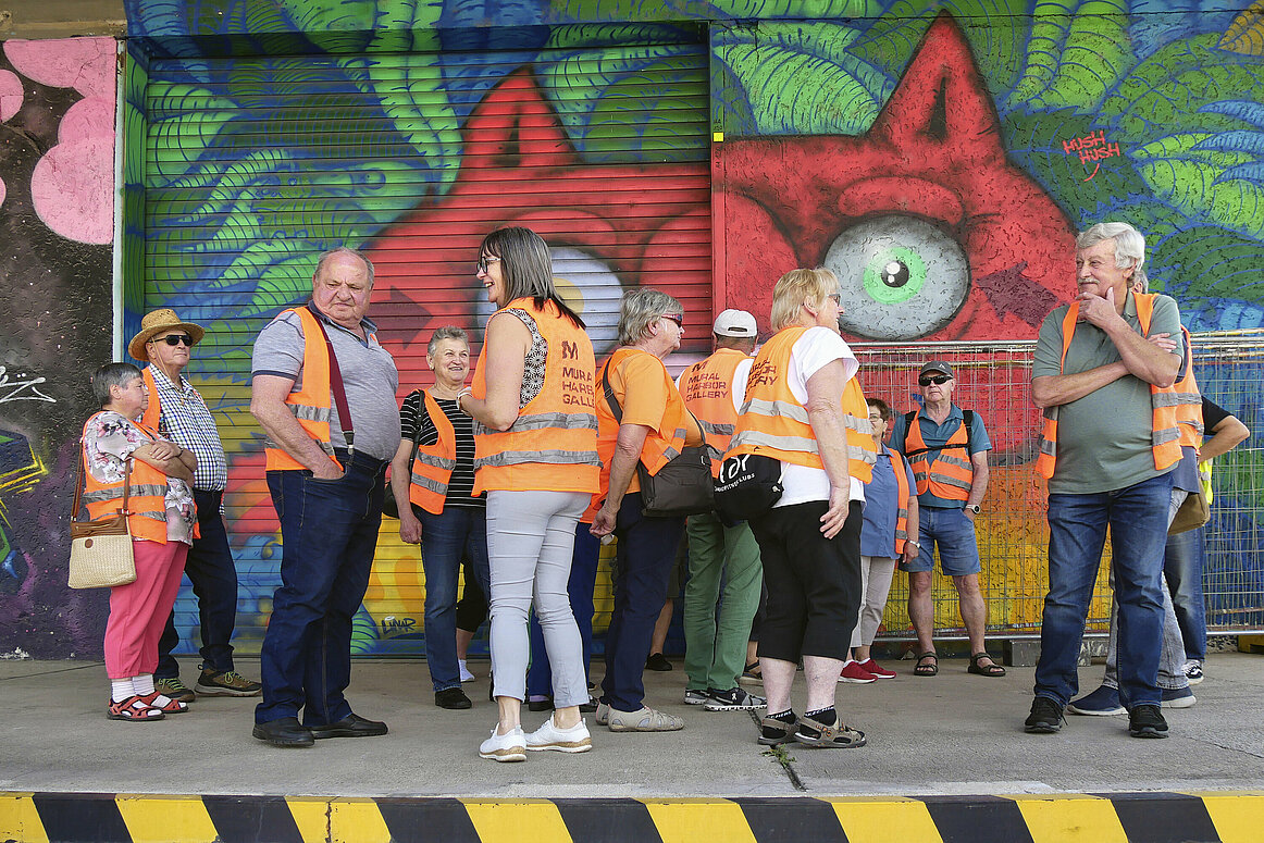 Bei strahlendem Wetter tauchten wir gemeinsam mit erfahrenen Guides in die faszinierende Welt des Mural Harbor ein. Wir wurden in zwei Gruppen aufgeteilt, um die beeindruckende Galerie auf dem Hafengelände zu erkunden. Auf insgesamt 135 Hektar erwarten Besucher mehr als 300 Murals. Viele Künstler*innen stammen aus der illegalen Graffitiszene und haben mit ihren Arbeiten die Straßenkunst maßgeblich geprägt.