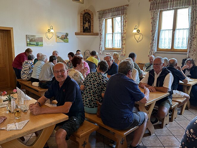 Anschließend ging die Fahrt weiter zum Weinheurigen Diry in Zagging zum Mittagessen. Eine Spezialität dieses Hauses ist das gebackene Dreierlei, bestehend aus einem gebackenen Schweinsschnitzel, einem gebackenen Surschnitzel und einem gebackenen Käse. Oder einem herzhaften Schweinsbraten mit Kraut und Knödel. Abschließend gab es noch einen selbstgemachten Apfel-, oder Topfenstrudel. Voll von schönen Eindrücken und kulinarischen Genüssen in gemütlicher Atmosphäre, traten wir dann schließlich wieder die Heimreise an.