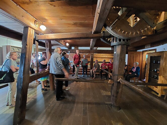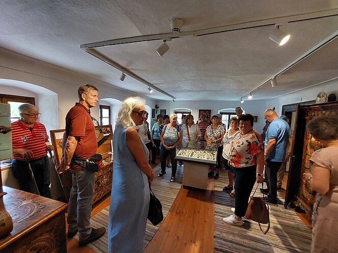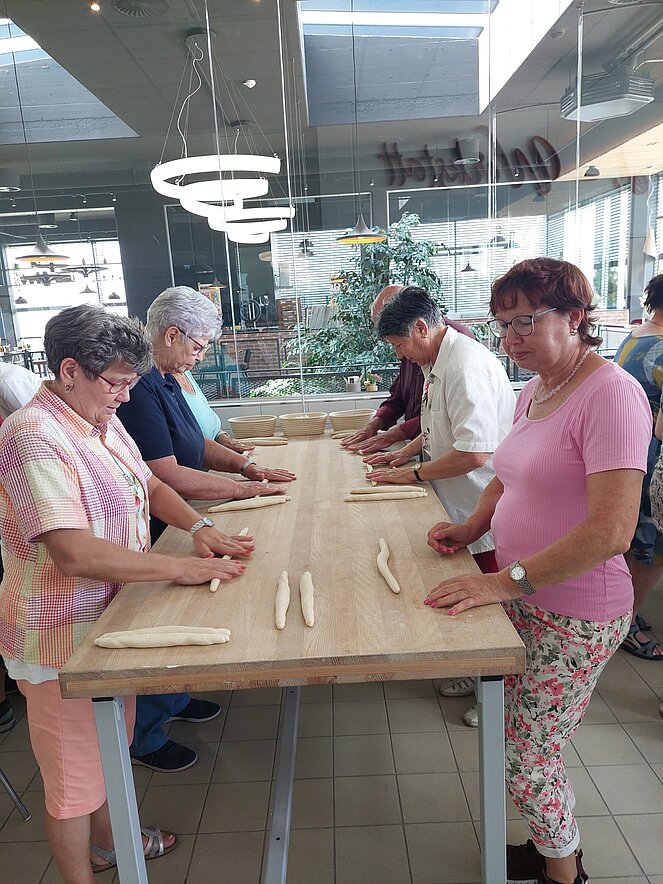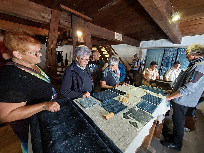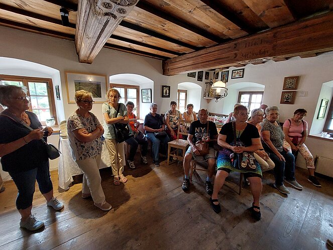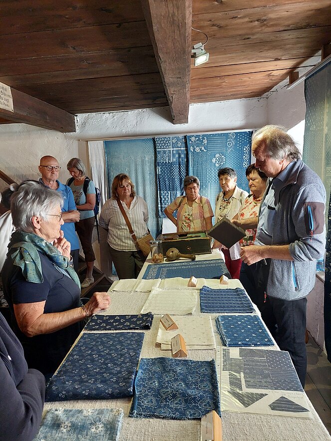 Über 40 Mitglieder nahmen am Ausflug, der uns zuerst nach Gutau ins Färbermuseum führte, teil. Dort erfuhren wir, wie der berühmte Blaudruck hergestellt wird, warum am Montag "blau gemacht" wird, was ein "blaues Wunder" ist und vieles mehr! Weiter ging es dann zur "Mühlviertler Landbäckerei" in Bad Leonfelden, wo wir selber unser Geschick in der "Bröselwerkstatt" ausprobieren konnten. Während unser selbstgemachtes Gebäck im Ofen gebacken wurde, saßen wir im "Brotkino". Nach dem Mittagessen ging es weiter ins Bauernmuseum Hirschbach. Dort entdeckten wir noch einige Dinge, die uns aus früheren Zeiten bekannt waren! Nach der Jause beim "Wirt in Selker" fuhren wir gestärkt nach Hause. Danke an Rosi Stadelbauer für den schönen Ausflug!