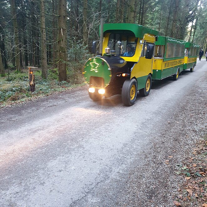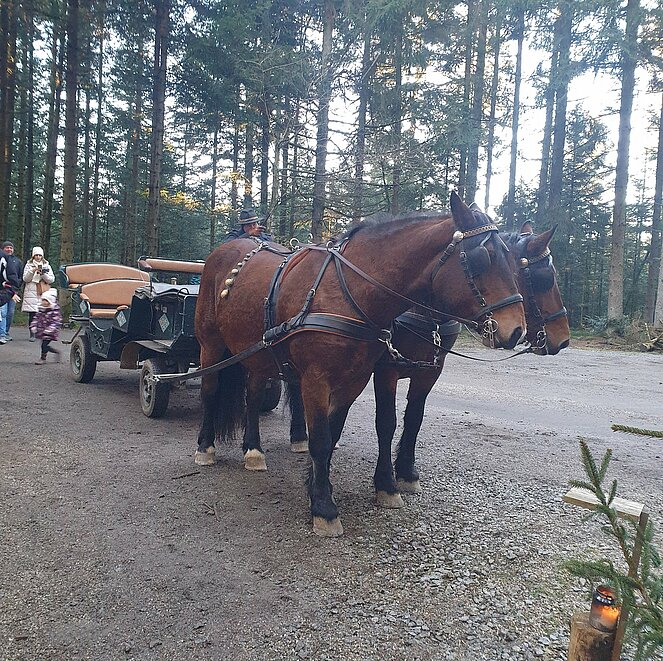 Nach einem kurzen Spaziergang, bei herrlichem Wetter, erreichten wir das Gelände der Waldweihnacht. Wem der Fußweg zu weit war, konnte das Gelände der Waldweihnacht entweder mit dem Shuttlebus, Bummelzug oder mit der Pferdekutsche erreichen.
