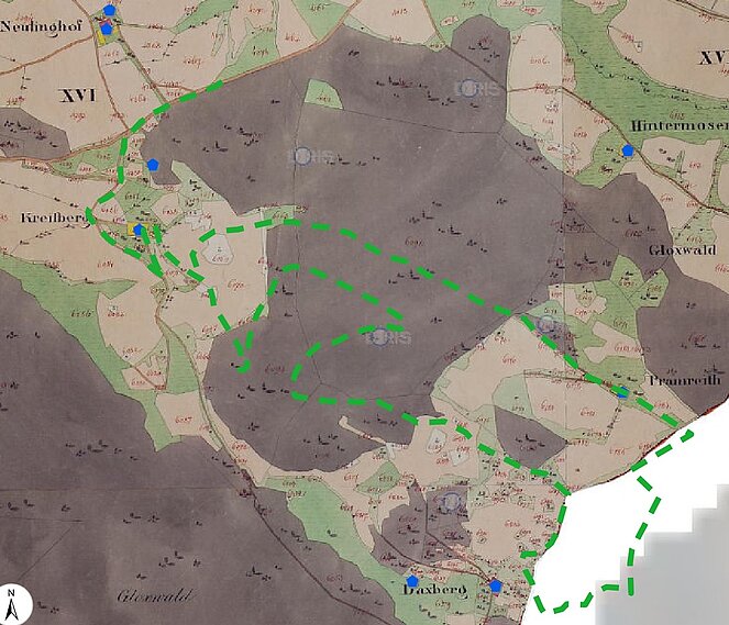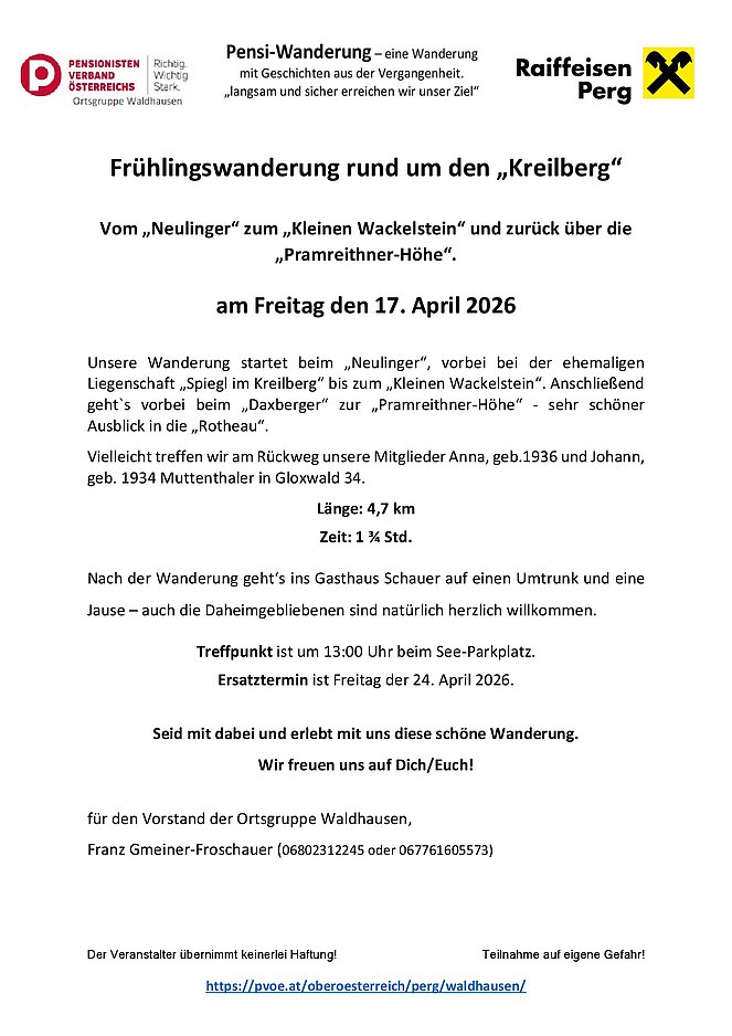Unsere Wanderung startet beim „Neulinger“, vorbei bei der ehemaligen Liegenschaft „Spiegl im Kreilberg“ bis zum „Kleinen Wackelstein“. Anschließend geht`s vorbei beim „Daxberger“ zur „Pramreithner-Höhe“ - sehr schöner Ausblick in die „Rotheau“. Vielleicht treffen wir am Rückweg unser Mitglieder Anna, geb.1936 und Johann, geb. 1934 Muttenthaler in Gloxwald 34.