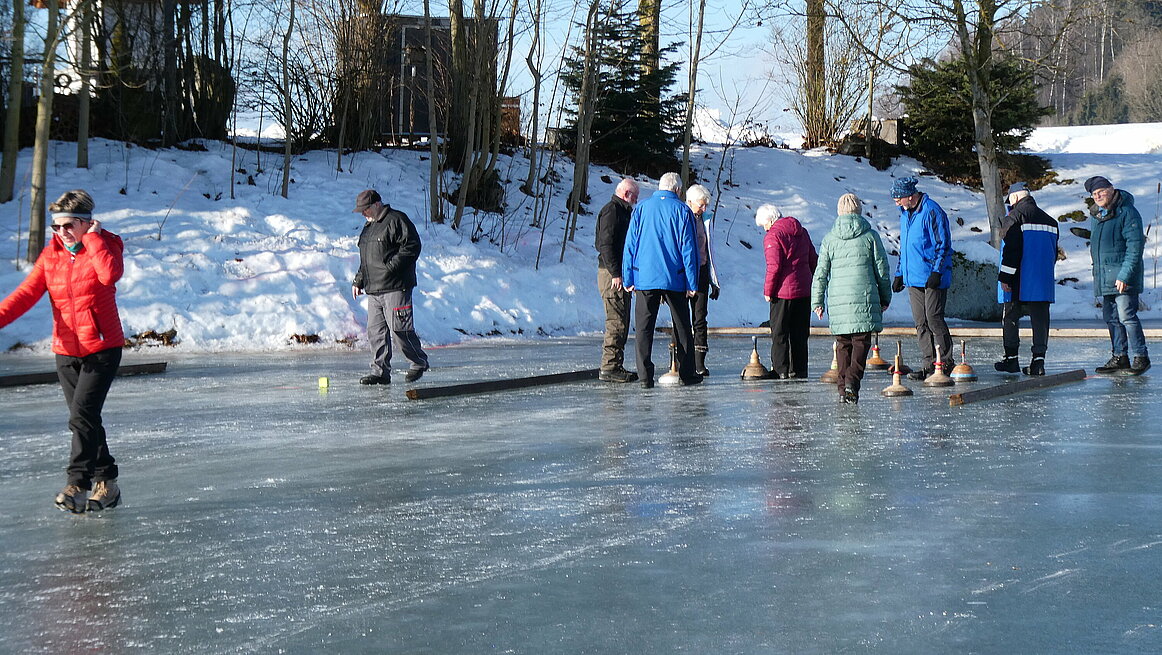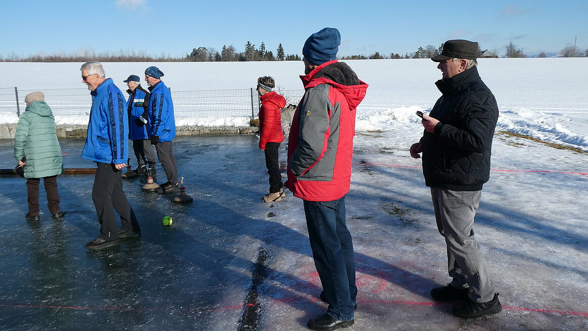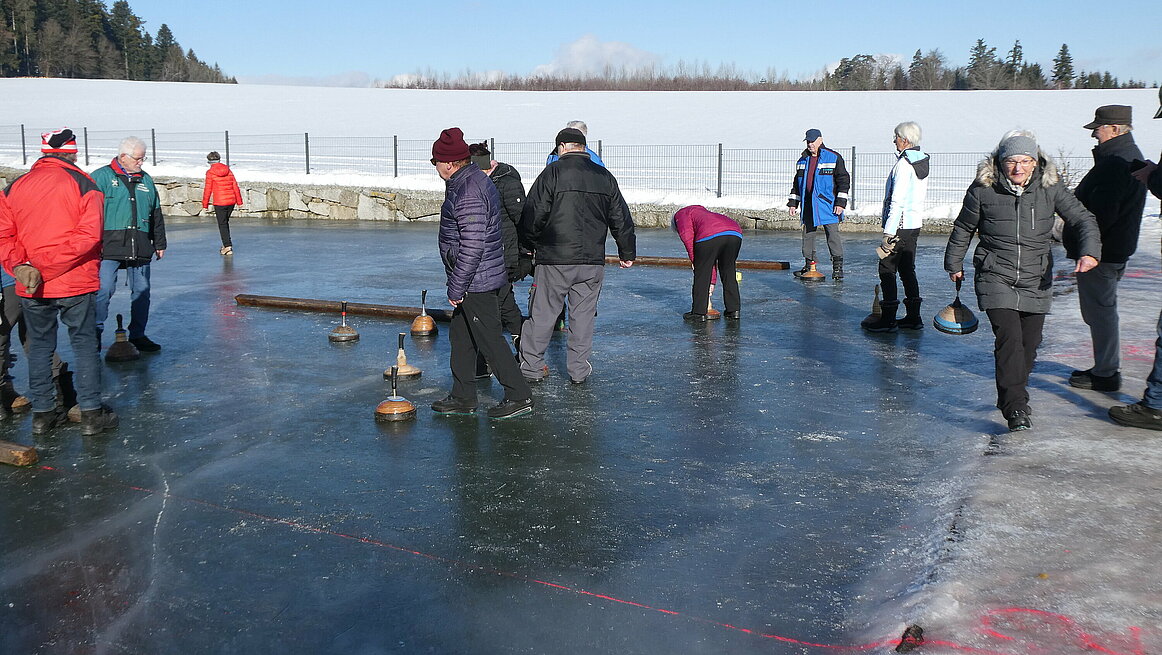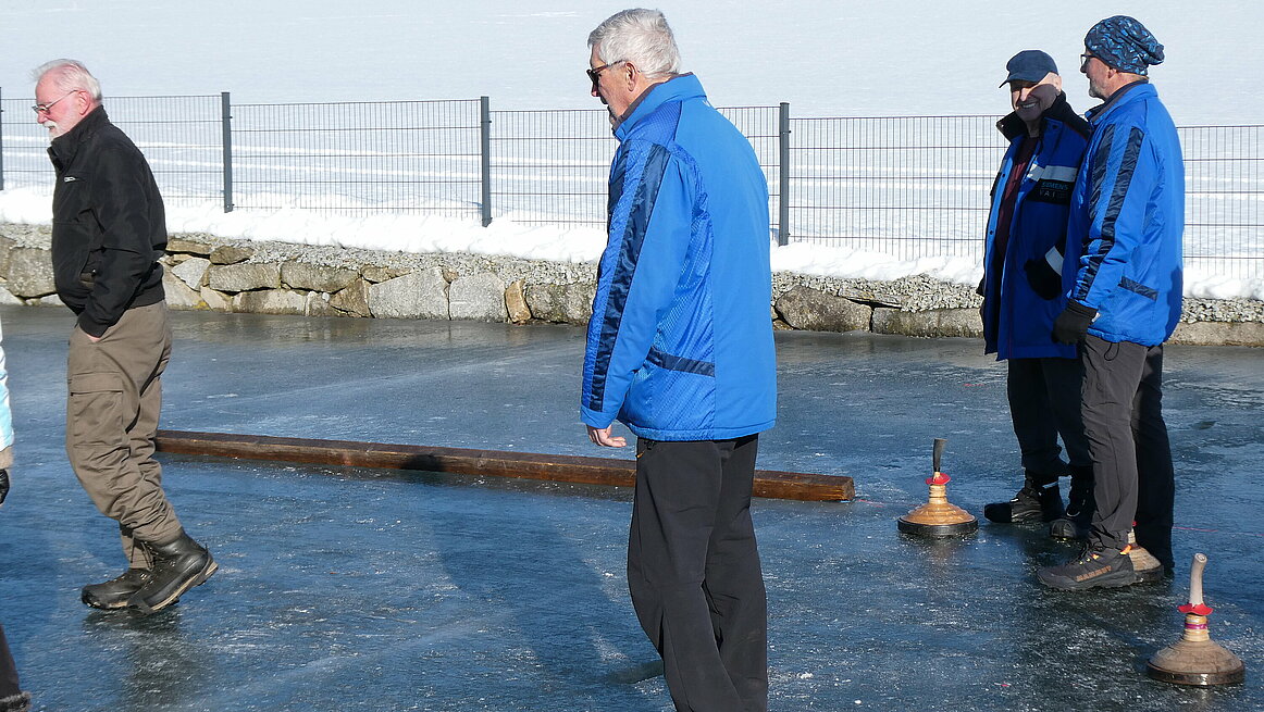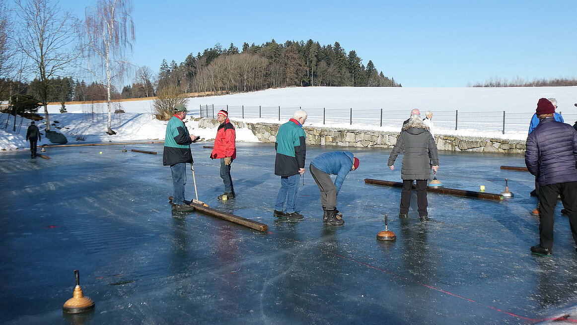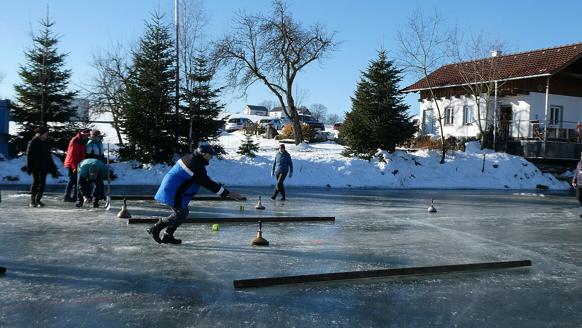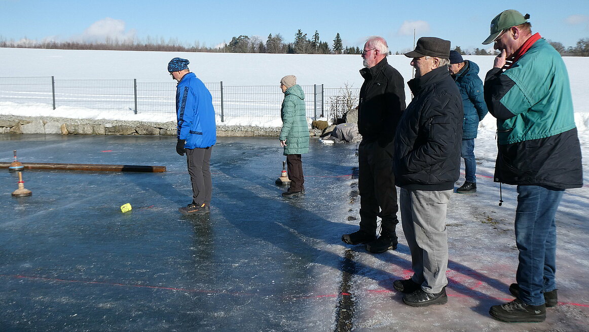 Obwohl es am Vortag noch geregnet hatte, präsentierte sich das Eis in perfektem Zustand. Dazu kam noch strahlender Sonnenschein, sodass wir wirklich ideale Bedingungen genießen konnten. Ein großes Dankeschön gilt auch für die sehr gute Vorbereitung der Anlage. Von 9:30 bis 12:00 wurden auf zwei Bahnen die Stöcke hin und her geschickt.