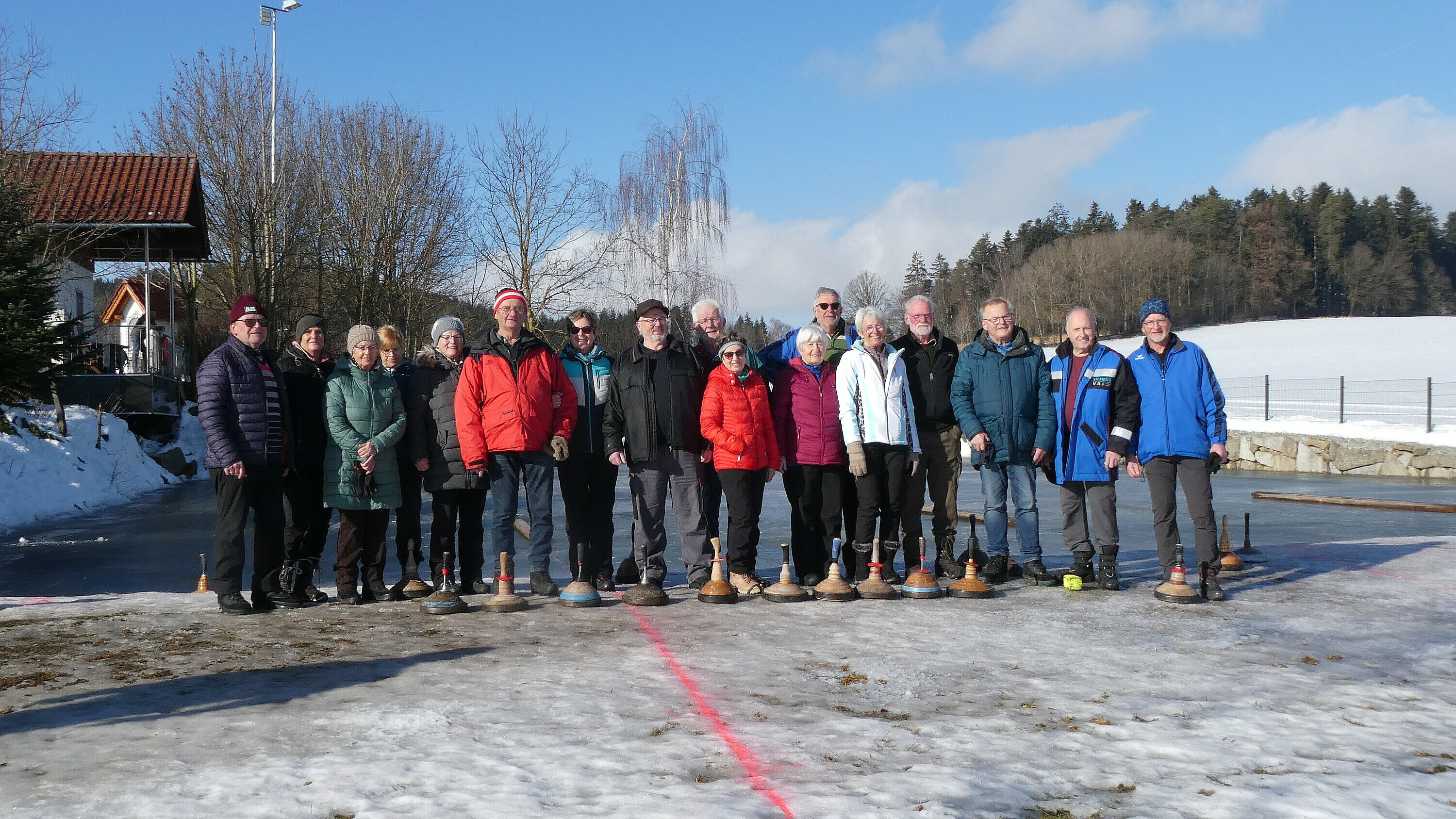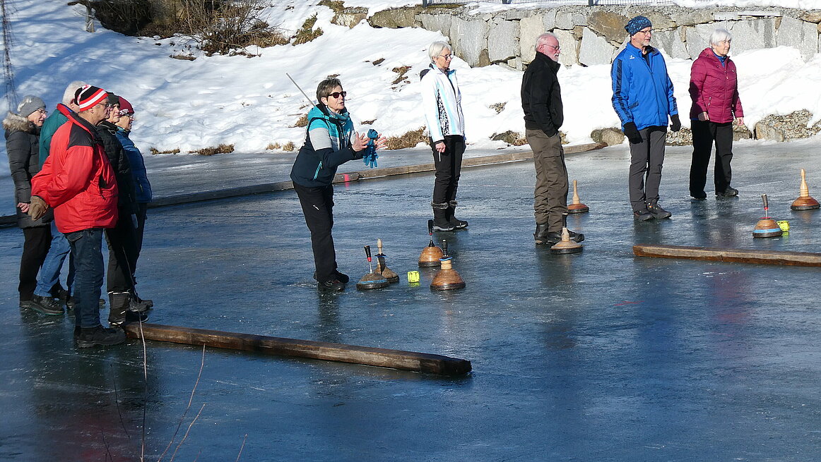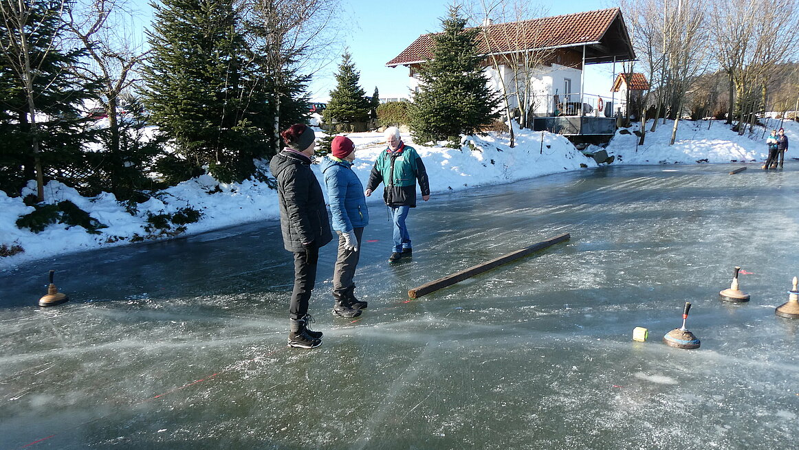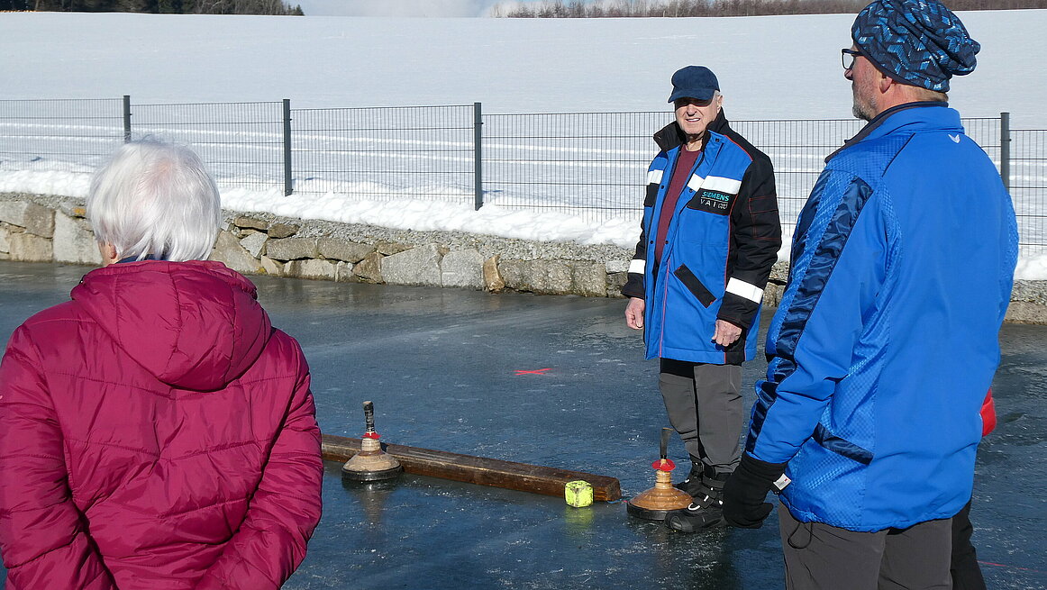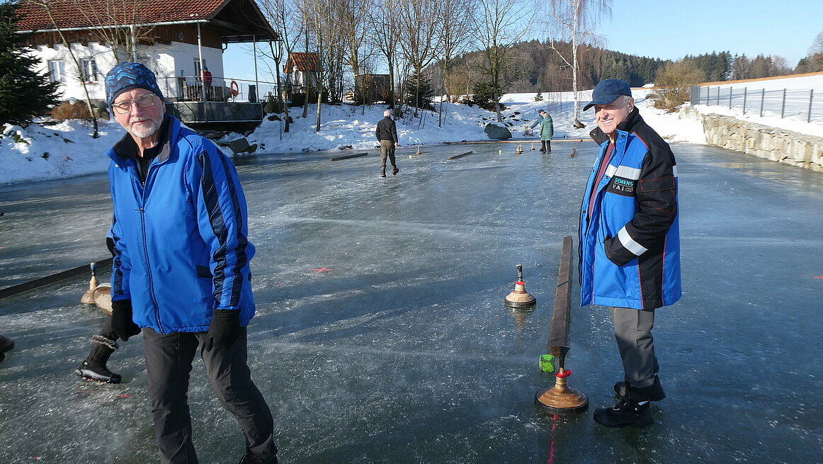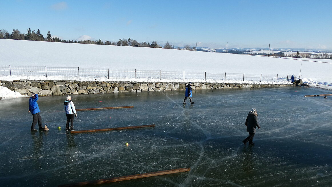 Obwohl es am Vortag noch geregnet hatte, präsentierte sich das Eis in perfektem Zustand. Dazu kam noch strahlender Sonnenschein, sodass wir wirklich ideale Bedingungen genießen konnten. Ein großes Dankeschön gilt auch für die sehr gute Vorbereitung der Anlage. Von 9:30 bis 12:00 wurden auf zwei Bahnen die Stöcke hin und her geschickt.