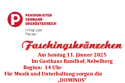 Die Ortsgruppe Peilstein lädt Euch (DICH) Herzlich zum Faschingskränzchen am Samstag, den 11. Jänner 2025, im Gasthaus Ramlhof in Nebelberg ein! Freut euch auf einen fröhlichen Nachmittag voller Spaß und guter Laune. Die Musik wird von der beliebten Band "DOMINOS" live gespielt, die für beste Unterhaltung sorgen wird. Der Unkostenbeitrag von 5€ ist auch sehr fair. Ich bin sicher, dass es ein fröhlicher Nachmittag wird! Kommt in Euren schönsten Kostümen und feiert mit uns den Fasching in geselliger Runde. Wir freuen uns auf zahlreiche Teilnehmer und einen unvergesslichen Nachmittag!
