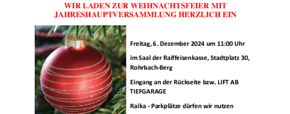 Freitag, 6. Dezember 2024 um 11:00 Uhr im Saal der Raiffeisenkasse, Stadtplatz 30, Rohrbach-Berg Eingang an der Rückseite bzw. LIFT AB TIEFGARAGE Raika - Parkplätze dürfen wir nutzen