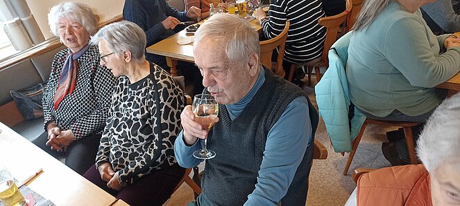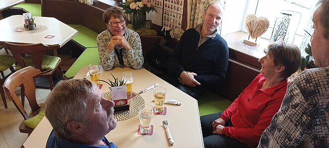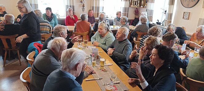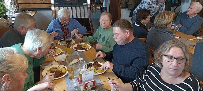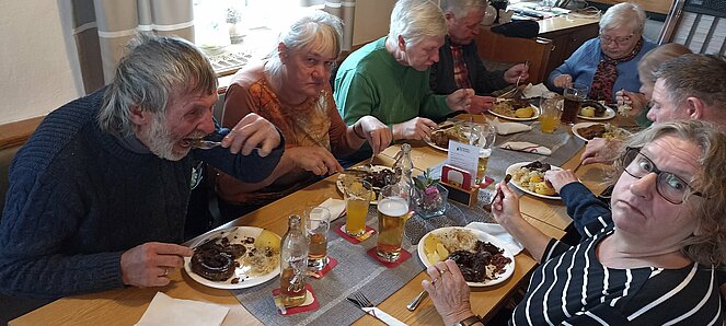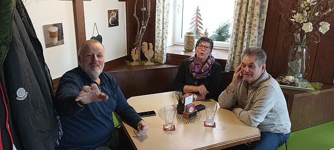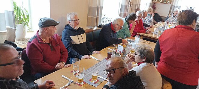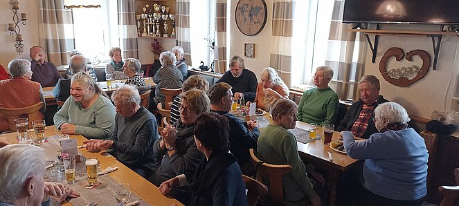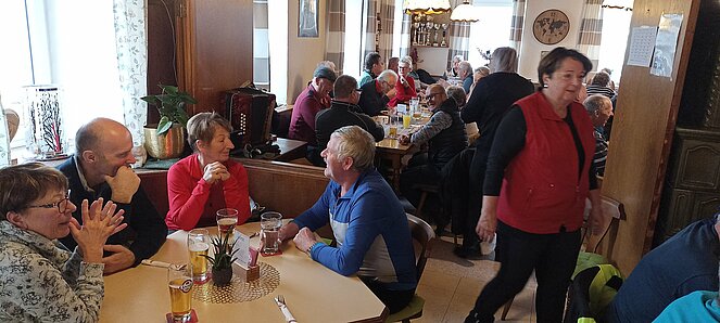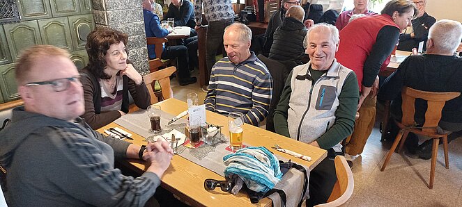 Nachdem wir uns in Harrau um 10.30 Uhr bei einem „Aufwärmer“ trafen sind wir über den Wandschamlweg Richtung Oberfischbach weiter nach Kimmerting und dann nach Öpping wo es mittags beim Simmelwirt "der EXTRA für uns Aufsperrte" dann mit herrlichen Leberschädl und a Blunzn also (a Schlimme Frau auf dem Teller) verköstigte die vorzüglich schmeckten.