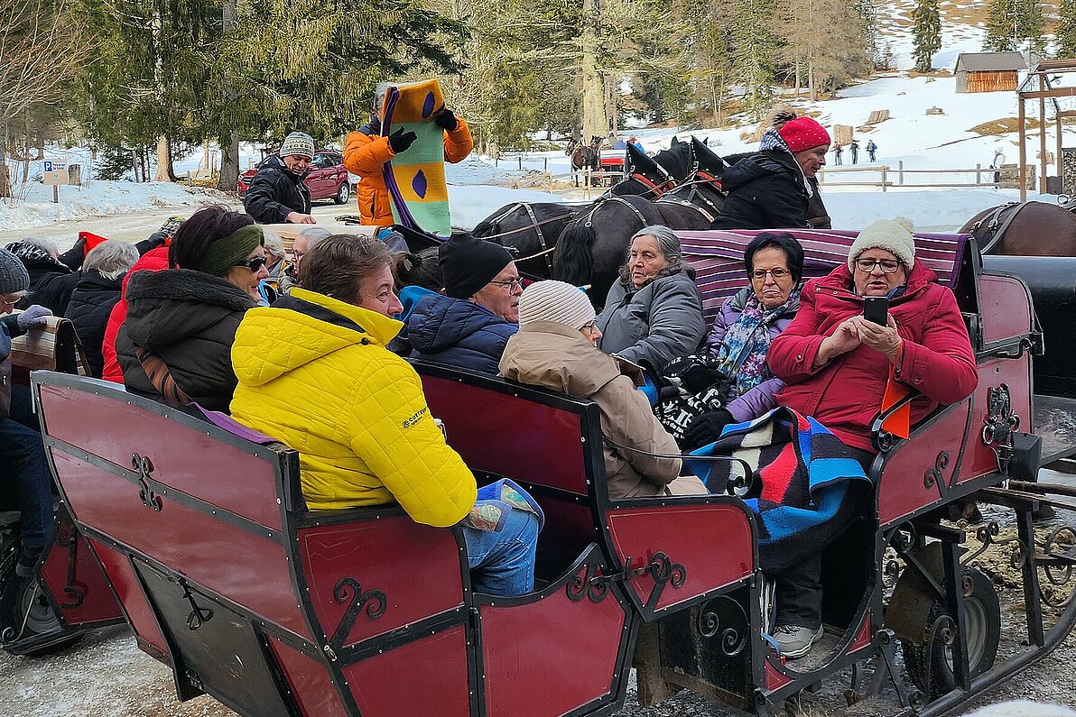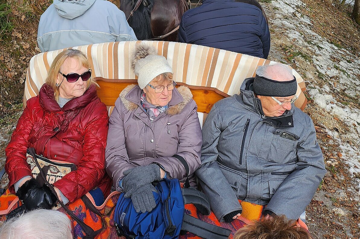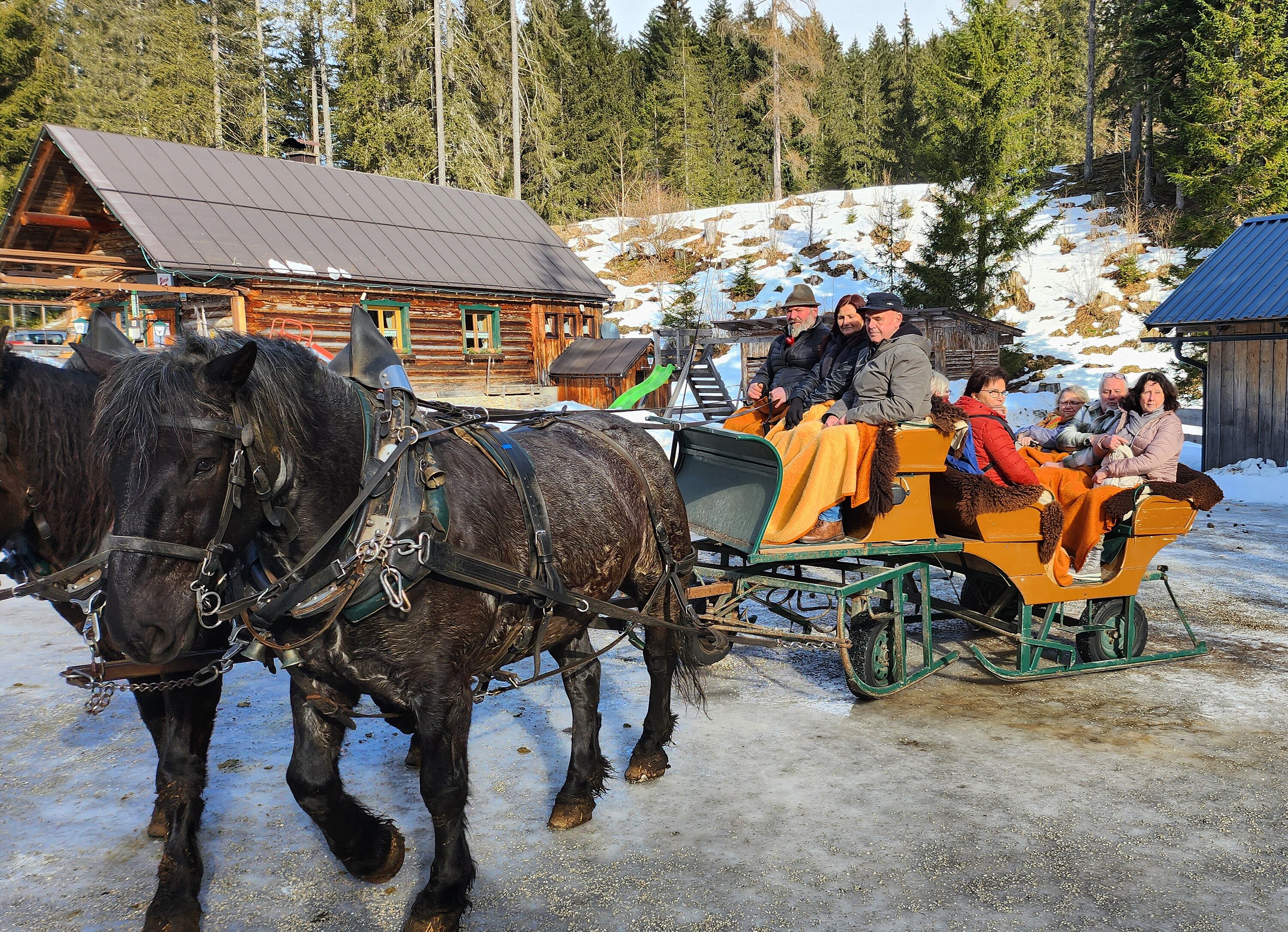 Mit dem Bus fuhren wir nach Bad Mitterndorf. Dort bestiegen wir die Pferdeschlitten und weiter ging die Reise durch die vorhandene Winterlandschaft zur Singerhaushütte zu einem gemütlichen Mittagessen. Nach einem kurzen Aufenthalt bestiegen wir wieder die Kutschen und genossen die Fahrt zurück.