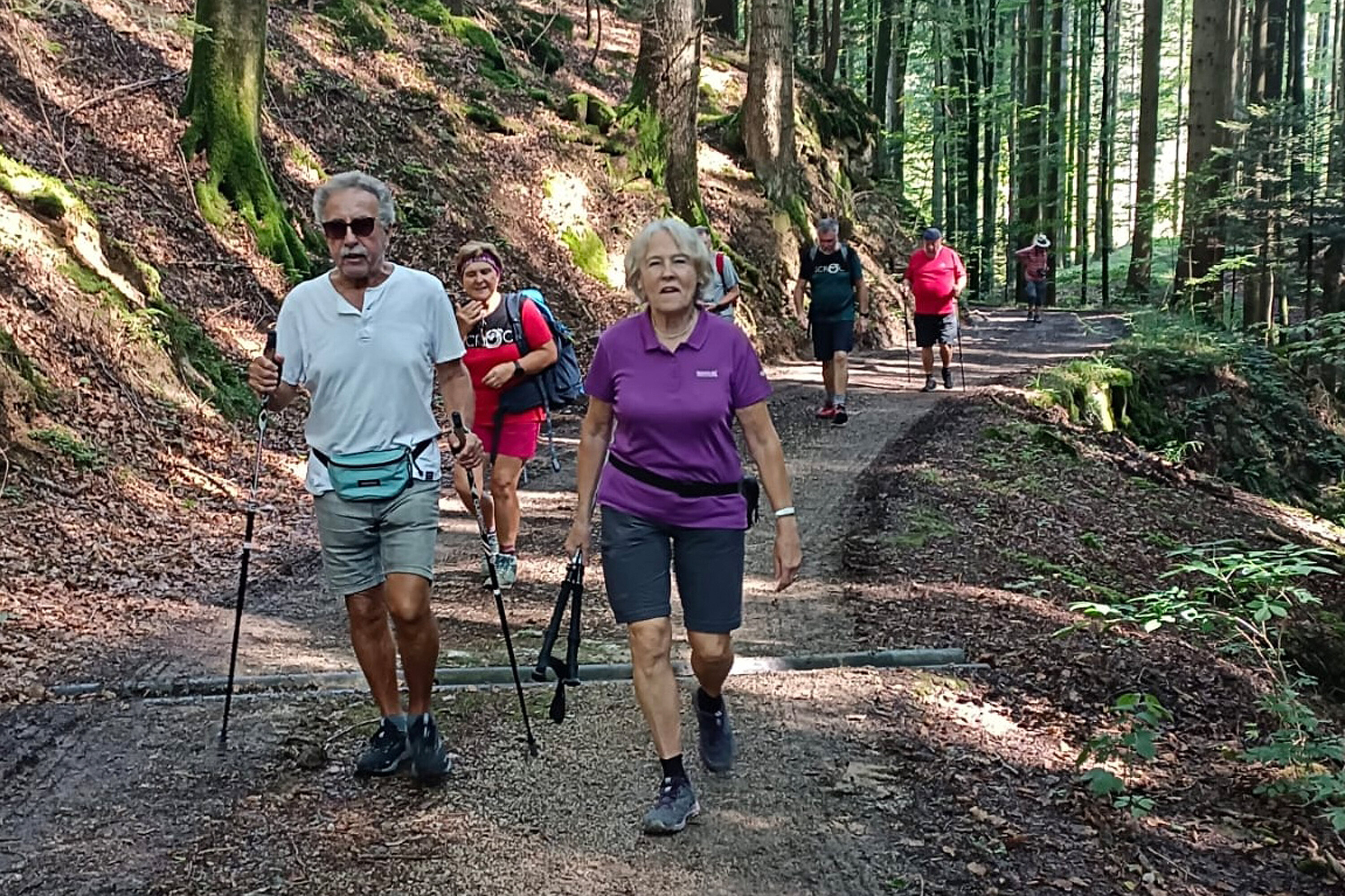 Dann ging es nur mehr bergab, über Wiesenfelder wieder neben einem Wald. Insgesamt mussten 6,5 Kilometer gewandert werden. Alle Teilnehmerinnen und Teilnehmer schafften es in 2 Stunden.