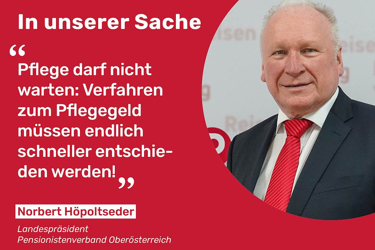 Als Interessenvertretung der älteren Generation sind wir täglich mit Beschwerden über lange Verfahrensdauern konfrontiert. „Je älter Menschen werden, desto rascher verändert sich auch ihr Gesundheitszustand. Bis über Anträge auf Pflegegeld entschieden wird, hat sich die Pflegebedürftigkeit oft bereits weiter erhöht – und damit auch der Anspruch auf eine höhere Einstufung. Das ist nicht akzeptabel!“, so Norbert Höpoltseder, Präsident des Pensionistenverbands Oberösterreich.