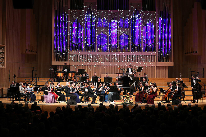 Im zweiten Konzertteil entführte Musicalstar Mark Seibert auf eine Reise durch die Welt des Musicals. Die jungen Musiker*innen Elena Freimüller (14) und Benni Atatah (15) sorgten mit ihren Gitarrenkünsten für Begeisterungsstürme.