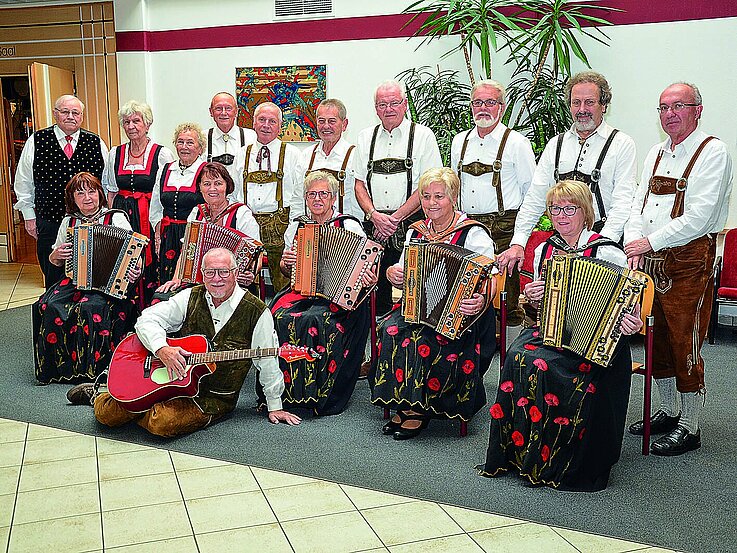 Sie sind insgesamt 18 Musiker*innen, spielen die steirische Harmonika “Quetschn” sowie Gitarren und haben ein Musikrepertoire von Walzern, Märschen, Evergreens, Boarische, Volksmusik etc.