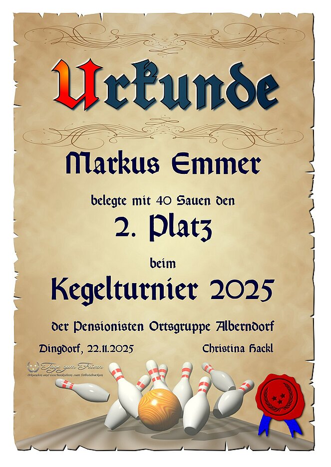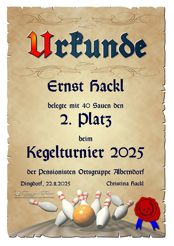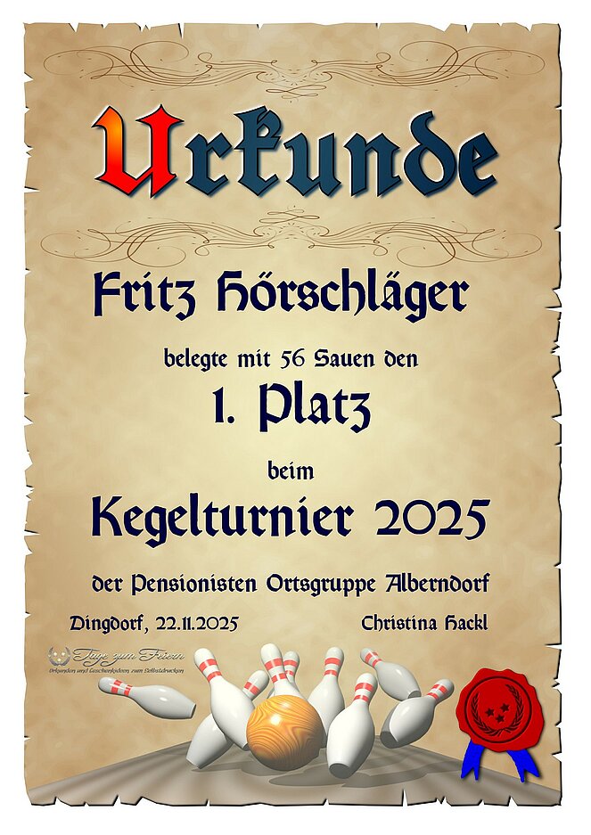 Der Kegelklub des Pensionisten Verbandes der OG-Alberndorf hielt am Samstag den 22. November 2025 seinen Jahresabschluss in der Jausenstation Poscher ab. Ein zünftiges Ritteressen sorgte von Beginn an für eine besonders gesellige und ausgelassene Atmosphäre.