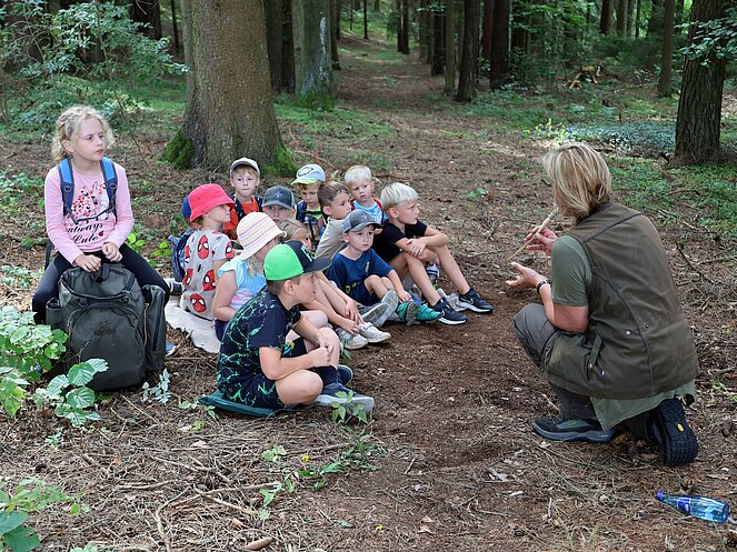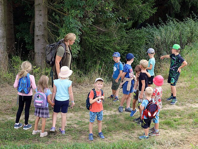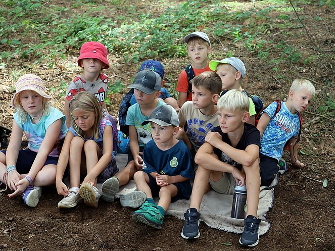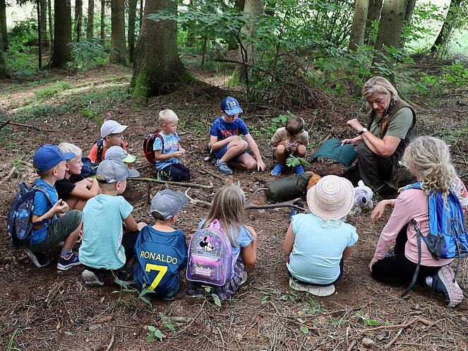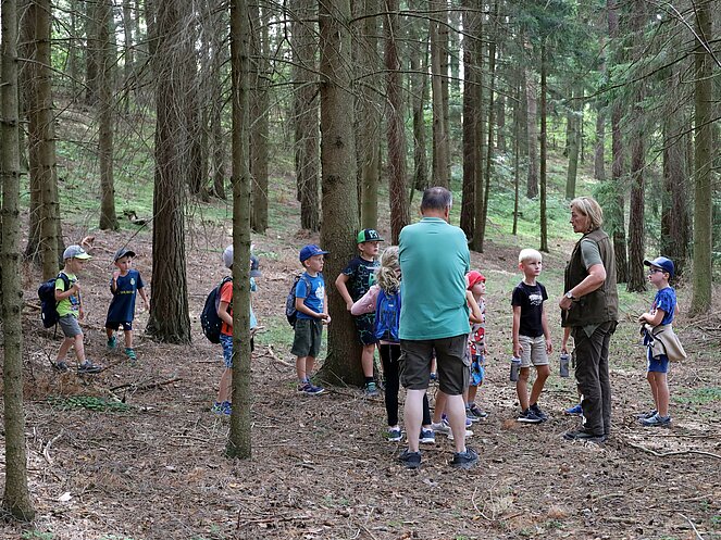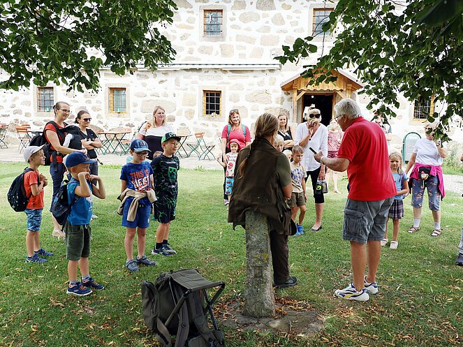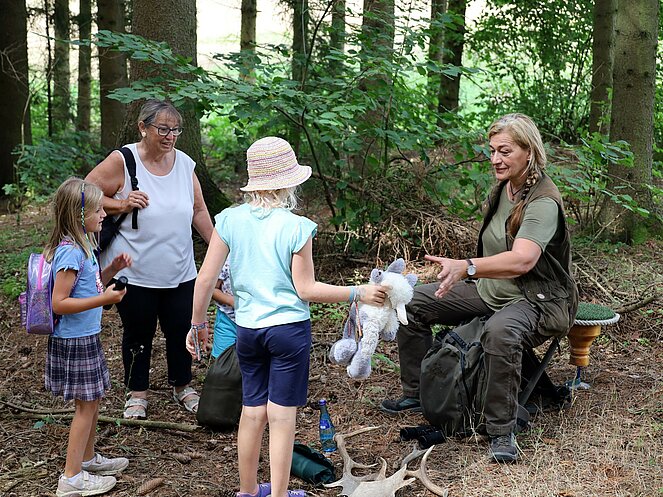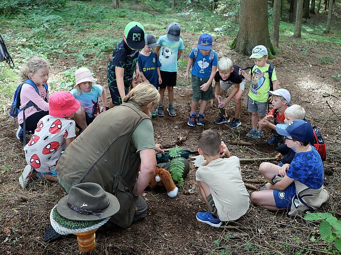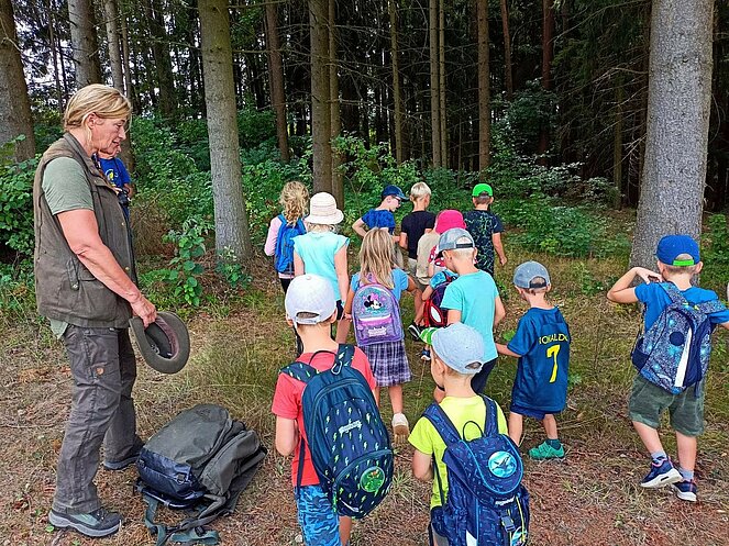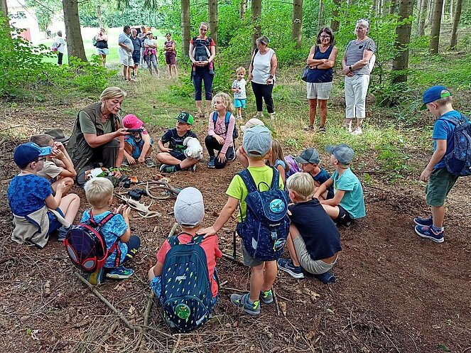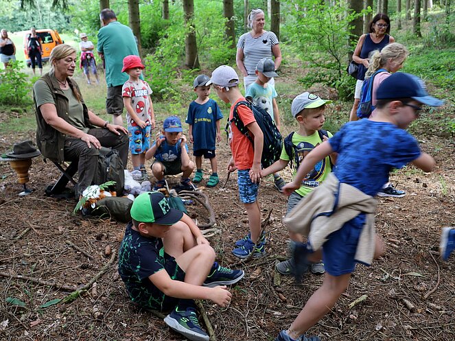 Die Jägerin Lisi hatte verschiedene Jagdgegenstände im Wald versteckt, die die Kinder mit großer Begeisterung suchten und zum Sammelplatz brachten. Dort erklärte Lisi die Bedeutung und Verwendung der gefundenen Objekte.