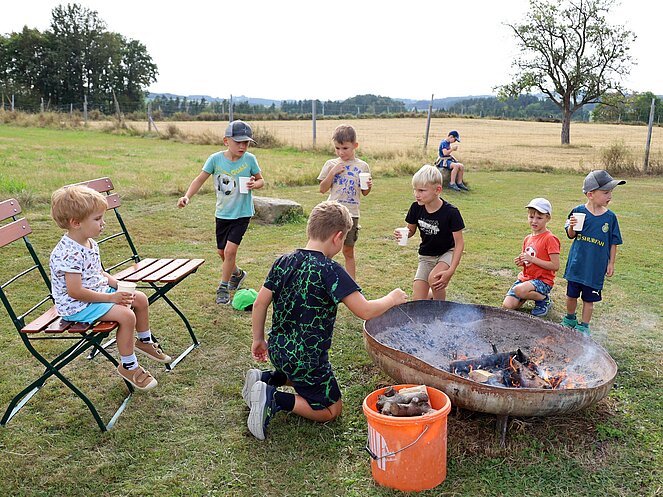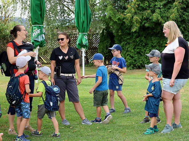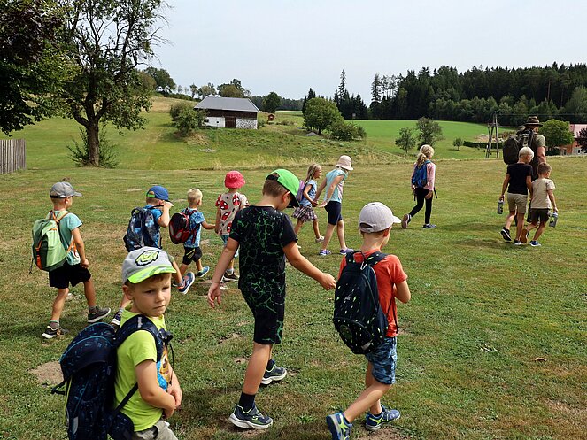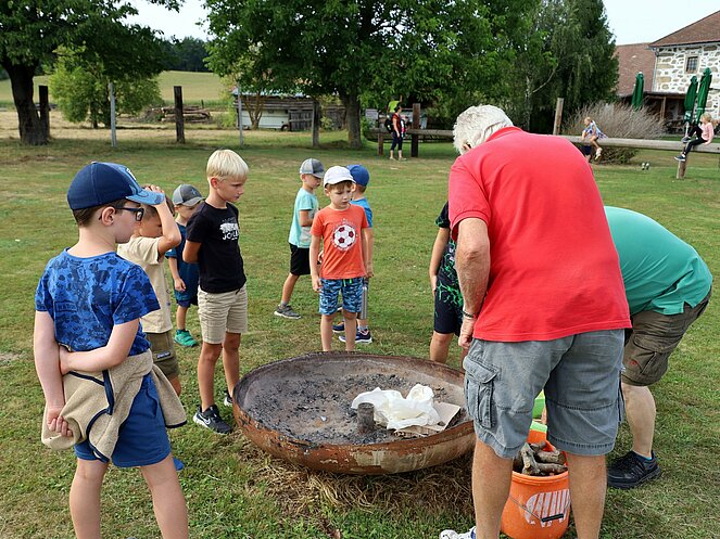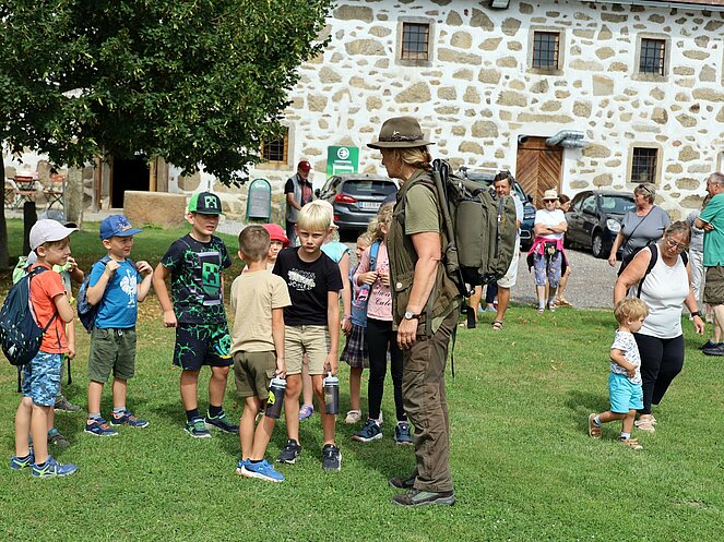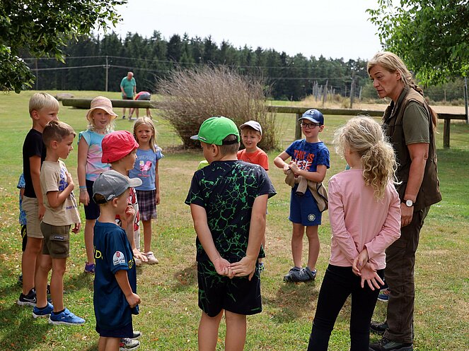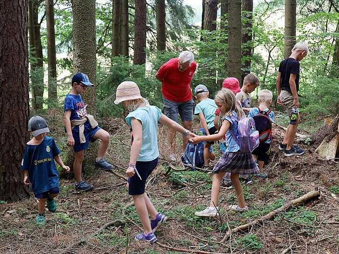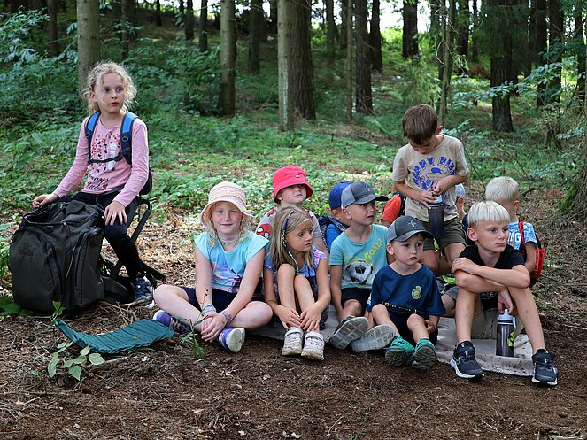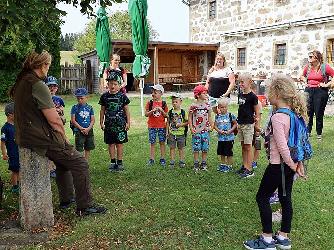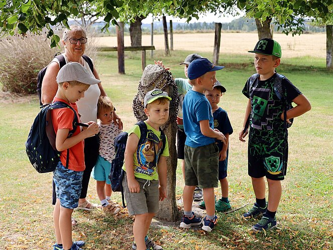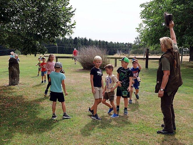 Die Jägerin Lisi hatte verschiedene Jagdgegenstände im Wald versteckt, die die Kinder mit großer Begeisterung suchten und zum Sammelplatz brachten. Dort erklärte Lisi die Bedeutung und Verwendung der gefundenen Objekte.