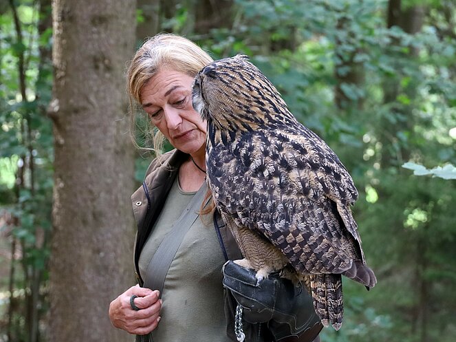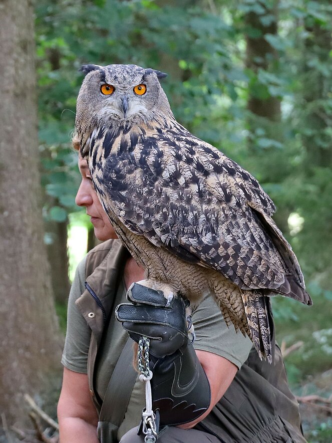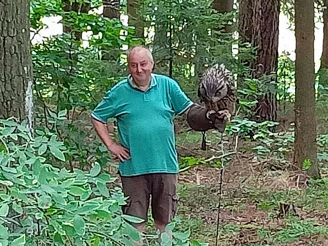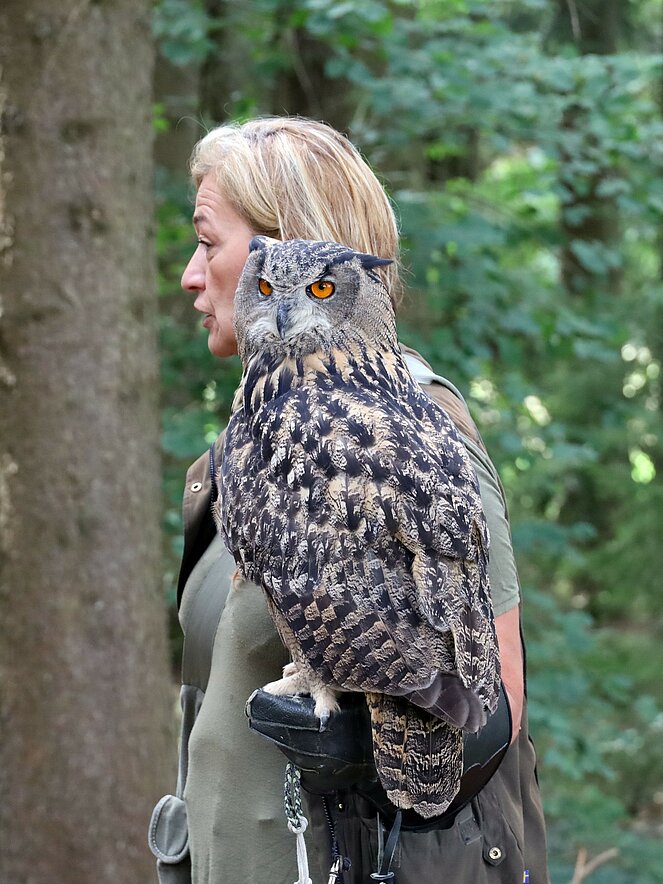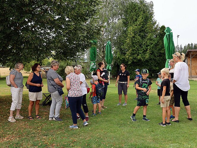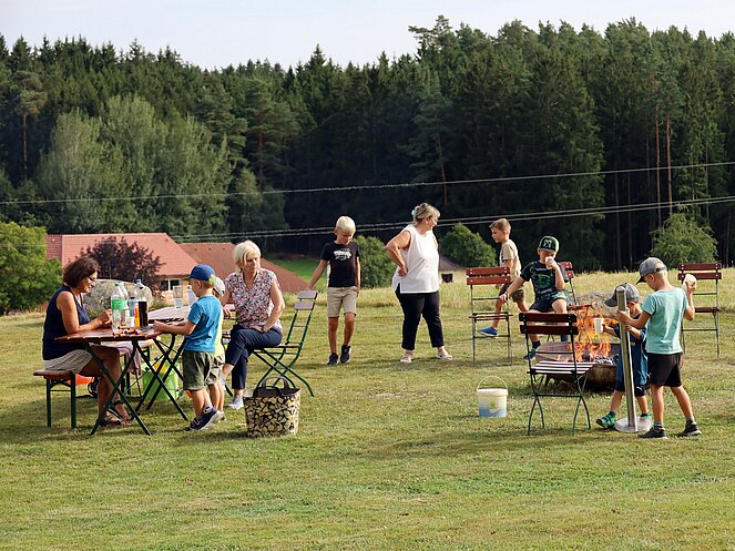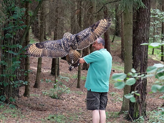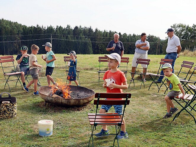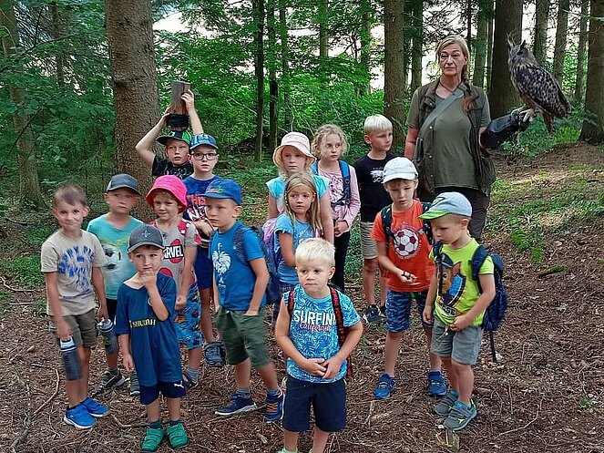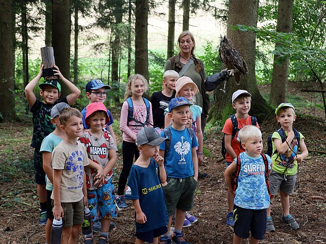 Ein besonderes Highlight war die Präsentation eines lebenden Uhus. Stefan Wimberger, mit einem dicken Lederhandschuh ausgestattet, zeigte dem Uhu eine Beute, die dieser sich beeindruckend schnappte. Nach einem Gruppenfoto mit Falknerin Lisi und dem Uhu ging es zurück zur Jausenstation Poscher, wo wir den Tag mit dem Grillen von Würstchen ausklingen ließen. Als Andenken erhielten alle Kinder, gestiftet vom OÖ-Landesjagdverband, ein Malbuch mit Informationen über heimische Wildtiere.