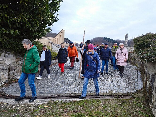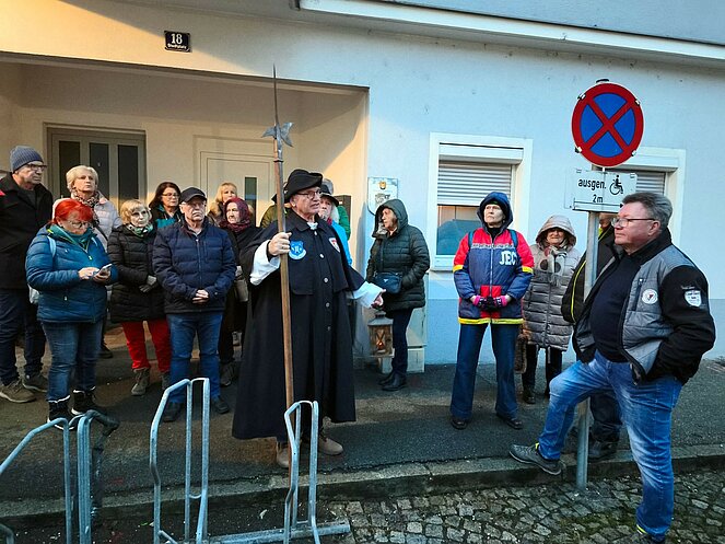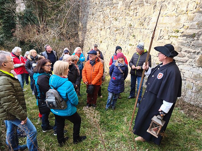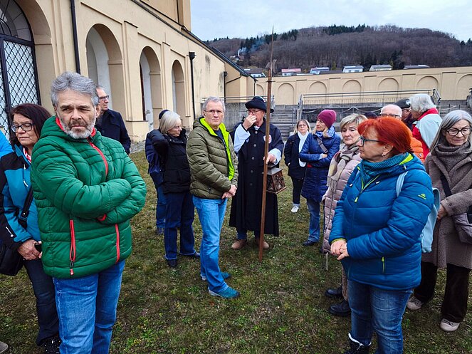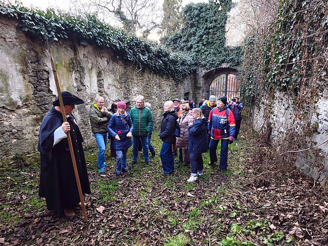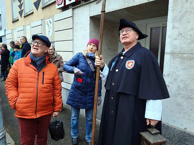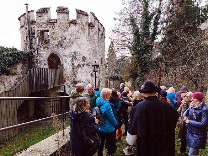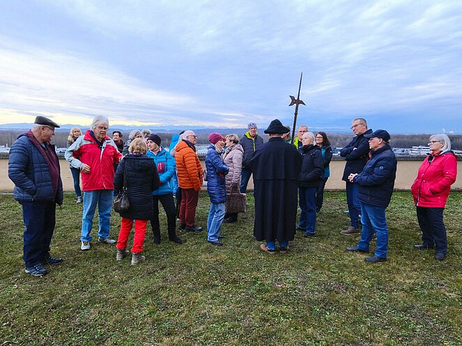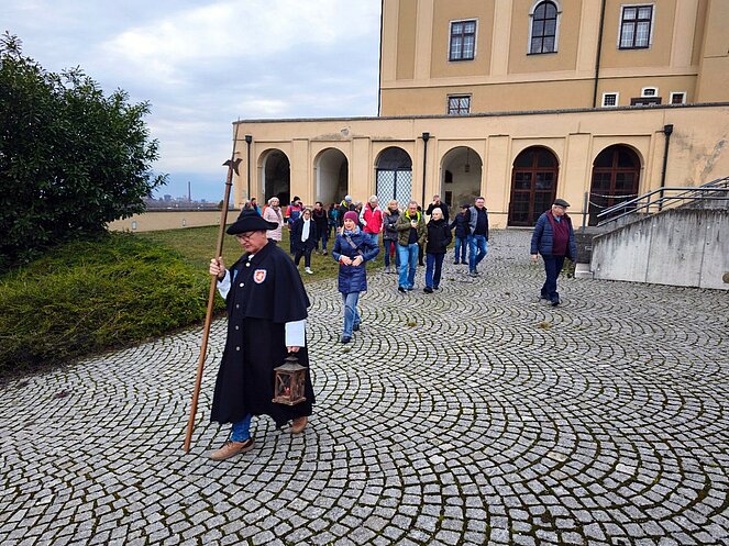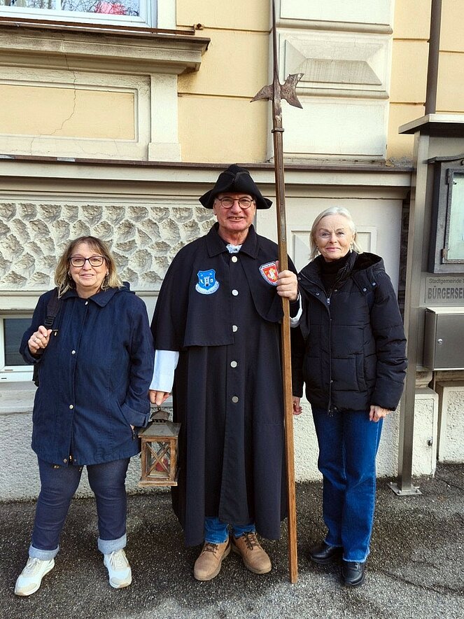 Am 12. Februar nahm uns der Steyregger Nachtwächter mit auf eine faszinierende Reise zu den geheimnisvollsten und geschichtsträchtigsten Orten der Stadt. Bei strahlendem Sonnenschein führte der Rundgang zunächst hinauf zum Schloss, wo wir einen beeindruckenden Blick über die Umgebung genießen konnten. Dort erzählte uns der Nachtwächter die bewegte Geschichte des Bauwerks. Besonders bemerkenswert: Der Schlossbrunnen reicht bis zum Grundwasserspiegel der Donau – rund 100 Meter tief.
