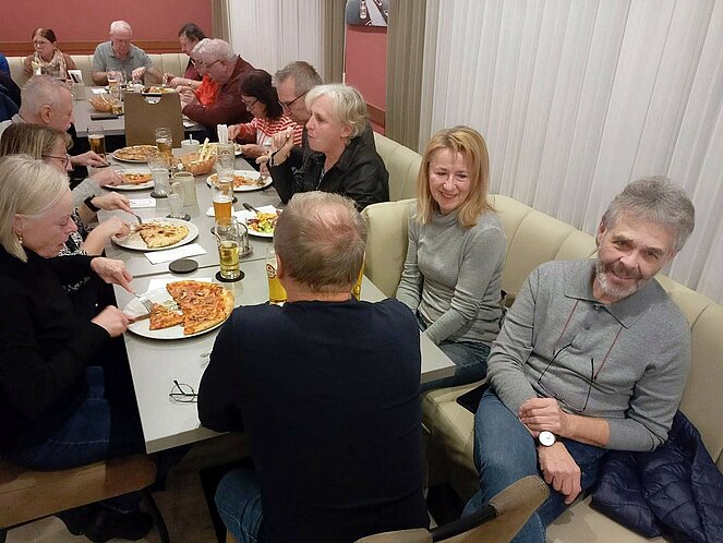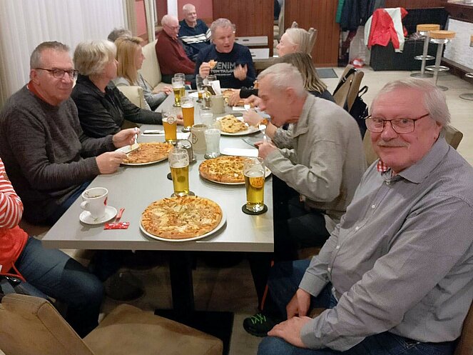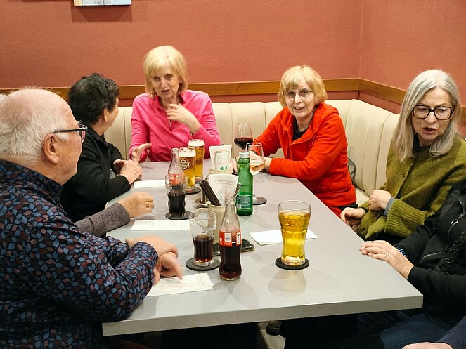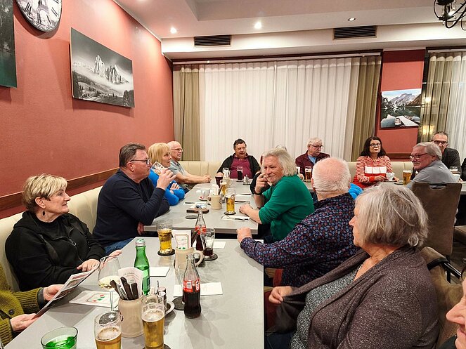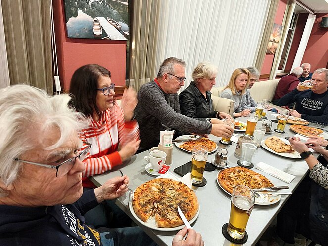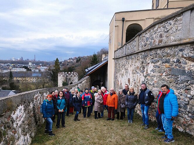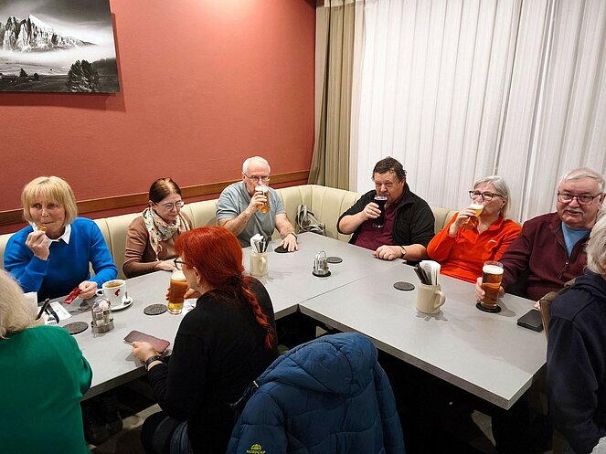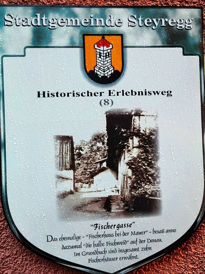 Weiter ging es durch das historische Zentrum mit Stadtplatz, Schwibbogen, Stadtturm, Fischergasse und Teilen der alten Stadtmauer. Der Erlebnisweg umfasst insgesamt 20 Stationen, die durch anschauliche Bild- und Texttafeln ergänzt werden. Ein besonderes Highlight sind die „Natur-Sandkeller“, die sich an der Nordseite jedes Hauses am Stadtplatz tief in den Schlossberg ziehen. Dank ihrer konstanten Temperatur eigneten sie sich über Jahrhunderte ideal zur Lagerung von Lebensmitteln. Ihre Entstehung wird in das 13. bis 14. Jahrhundert – die Zeit der Marktgründung Steyreggs – datiert. Gegen Ende des Rundgangs überraschte uns leider der Regen, sodass wir uns umso mehr auf die Einkehr beim Stadtwirt freuten.
