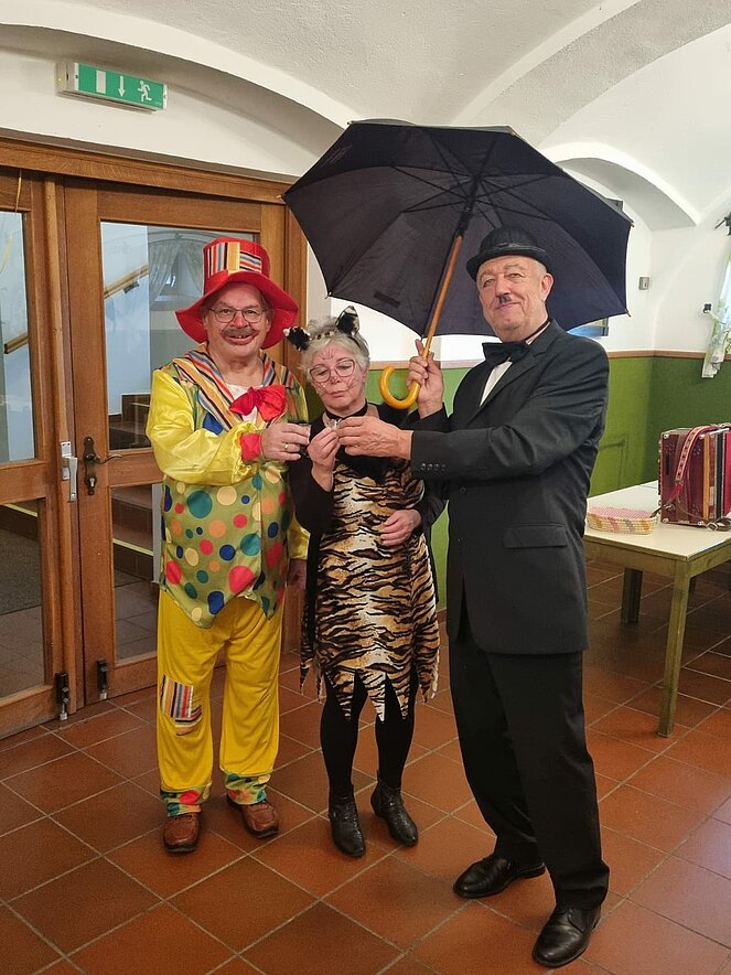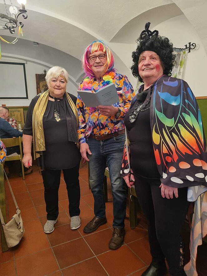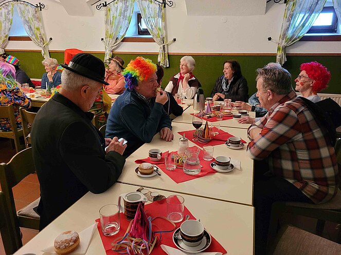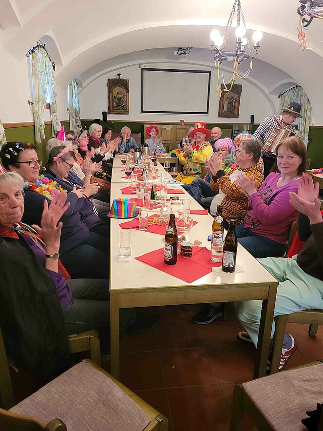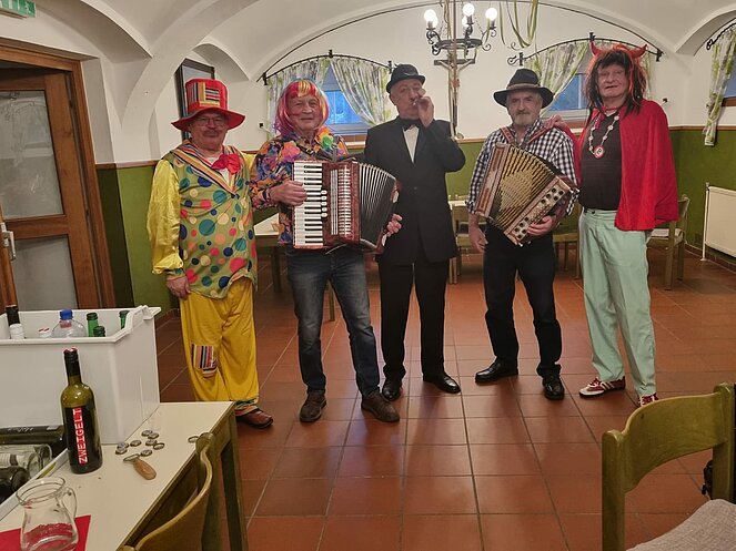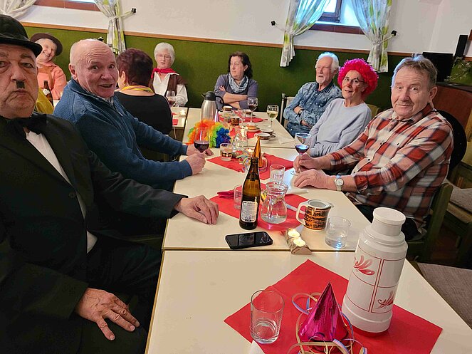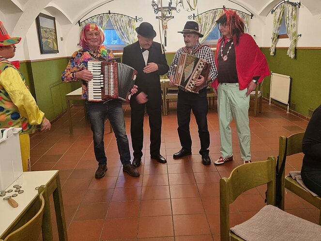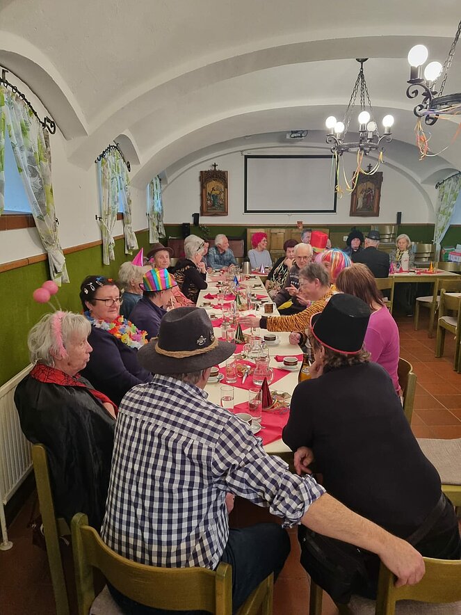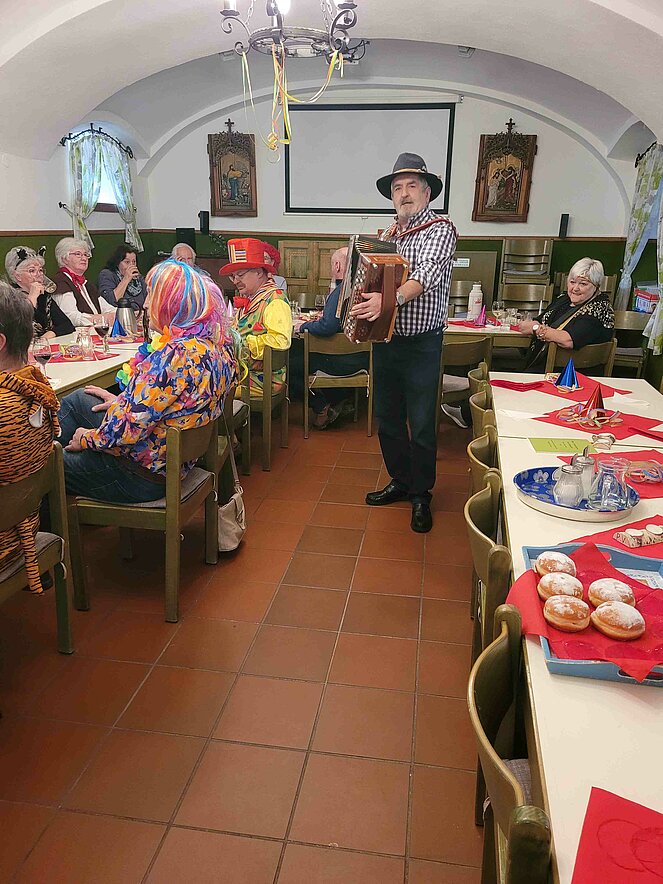Lustig wie immer war am 6. Februar wieder die traditionelle Faschingsfeier, abgehalten diesmal im Pfarrzentrum Bad Leonfelden. Die zwei Spielmänner Erich Speta und Stefan Wolschlager unterhielten uns mit ihrer „Quetschn“ . Wir ließen uns die Faschingskrapfen sowie anschließend die „Schnitzelsemmel“ gut schmecken und hielten durch bei Sang und Tanz bis in die späten Abendstunden.