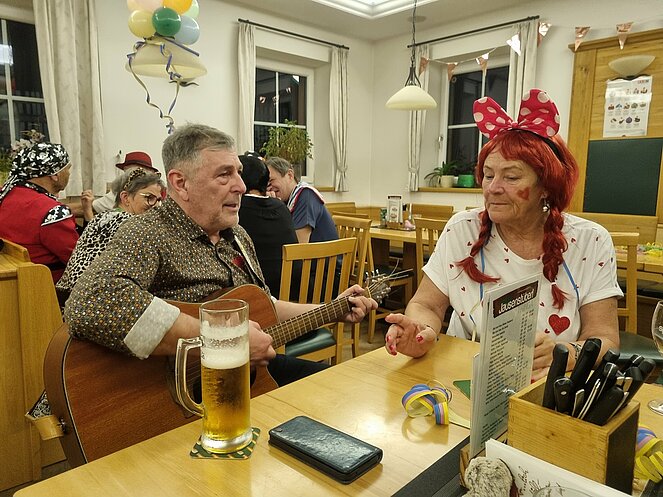 Leider waren 2 unserer Musikanten (Erich und Manfred) gesundheitsbedingt verhindert. Peter brachte mit seiner Gitarre aber auch als „Alleinunterhalter“, begleitet von unseren gesangserprobten Damen, musikalische Stimmung in unsere Faschingsrunde.