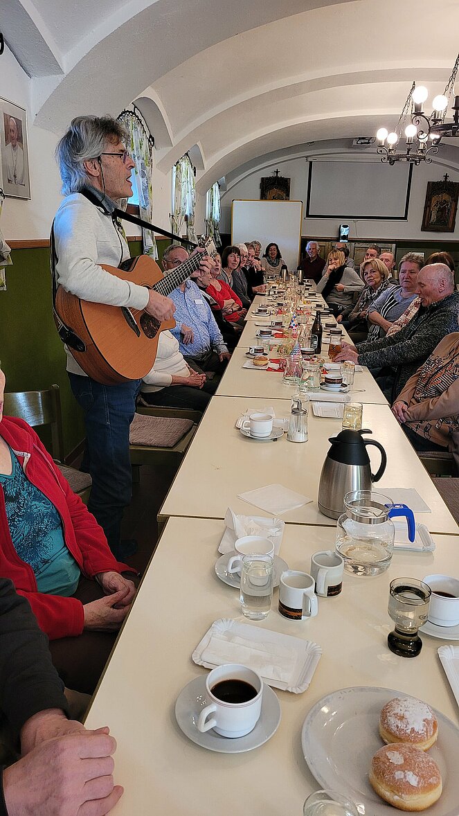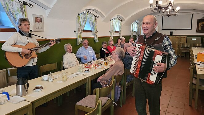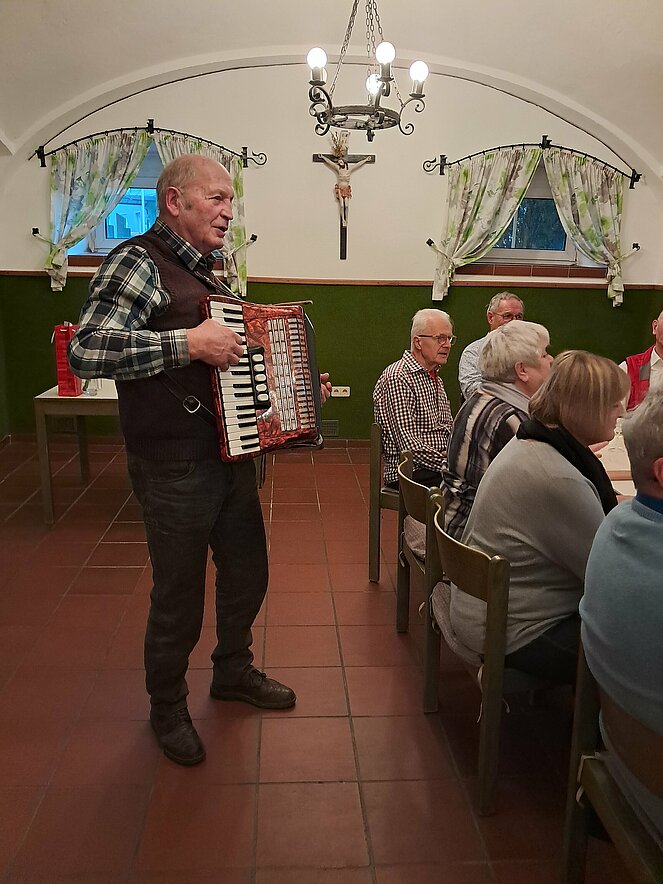 Mit diesem Lied (Pensionistenlied) haben wir unseren gemütlichen Nachmittag im Pfarrzentrum begonnen und gegen Abend mit bekannten alten Liedern und Schlagern -bestens gelaunt - beendet. Musikalisch begleitet wurden wir von Vors.Stv. Erich Speta mit seiner „Quetschn“, sowie Manfred Neulinger auf der Gitarre.