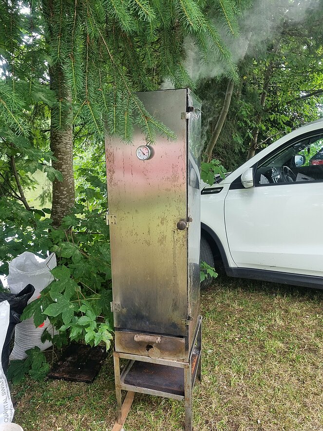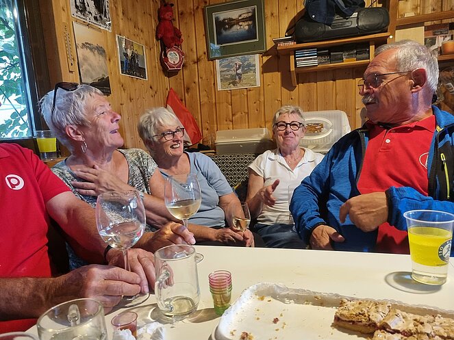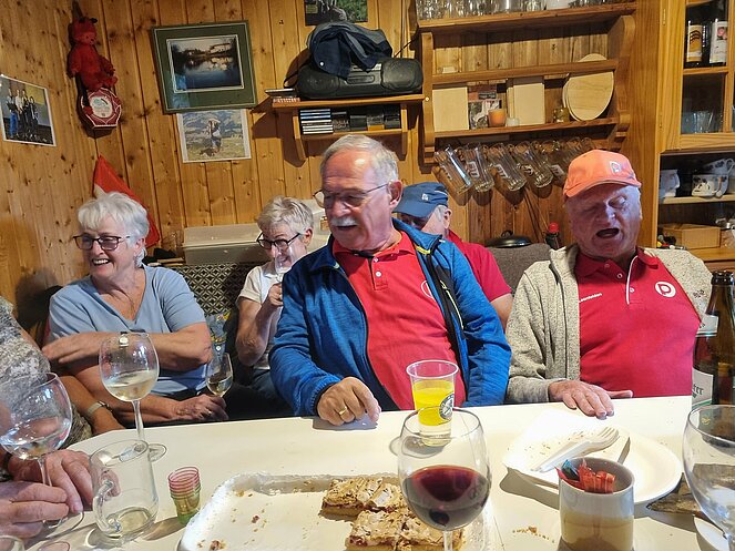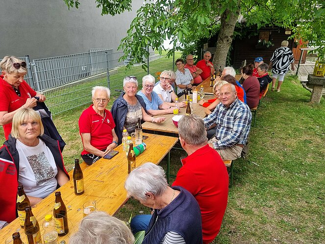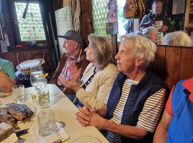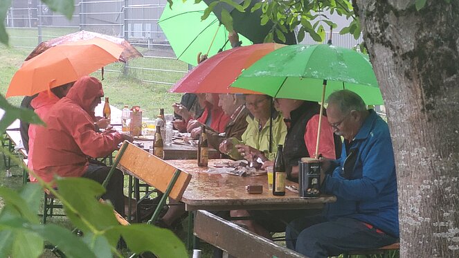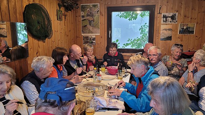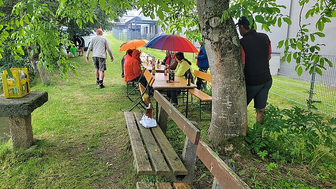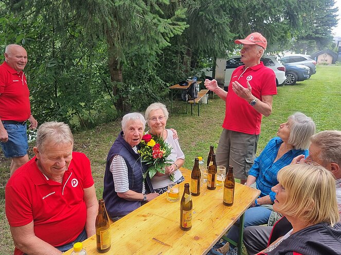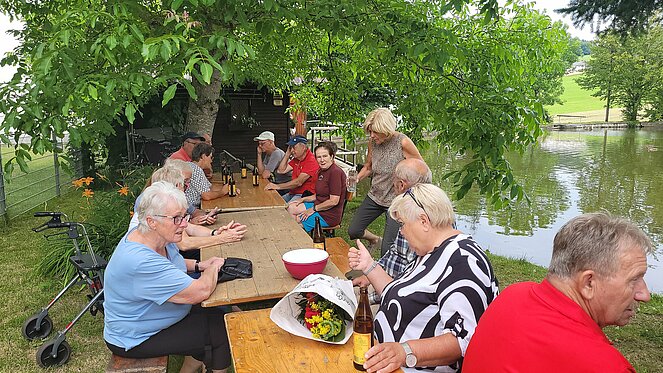 Die Wartezeit auf die Räucherforellen wurde durch Getränke, Unterhaltung und einer Ansprache unseres Vorsitzenden Günther Baumgartner verkürzt. Dabei wurde auch der Familie Stumptner für die Einladung gedankt und Anneliese ein Strauß Blumen überreicht.