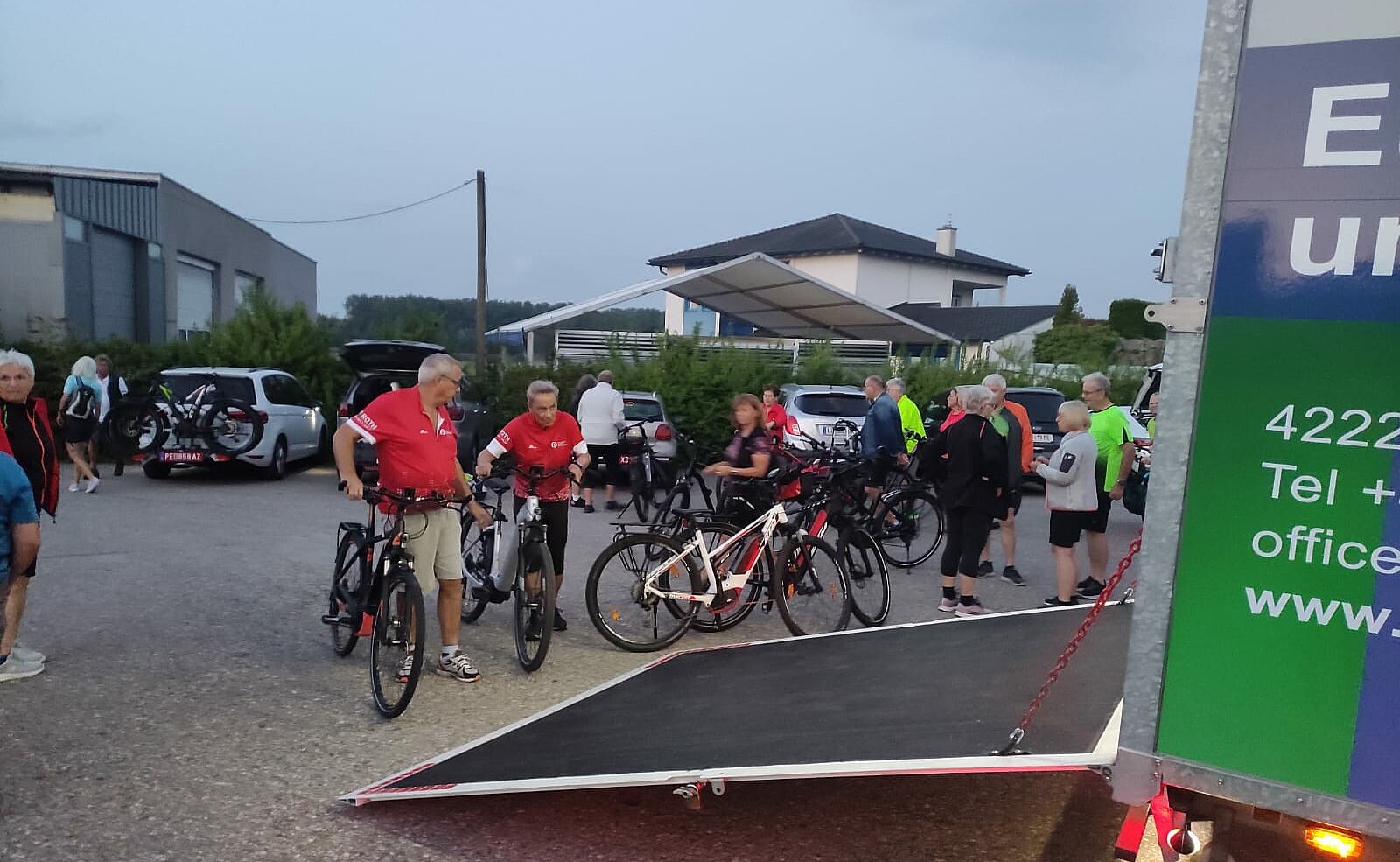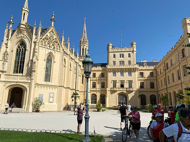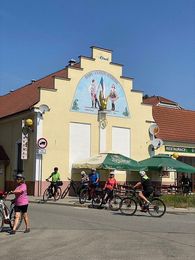 Die Anreise am erste Tag erfolgte mit dem Bus von St. Georgen über Drasenhofen bis zum Schloss Lednice. Ab Lednice ging es mit dem Rad durch das Zentrum des ehemals Großmährischen Reiches, vorbei an der romantischen Burgruine Janov Hrad (Hansenburg), dem Schloss Pohansko, zur Bezirksstadt Breclav (Lundenburg). Durch den Auwald weiter nach Mikulcice (Mikultschitz) bis zur Kreisstadt Hodonin (Göding). Nach 50 km wurden die Räder wieder verladen und der Bus brachte uns nach Straznice in unser Hotel, wo wir für 4 Nächte eincheckten.