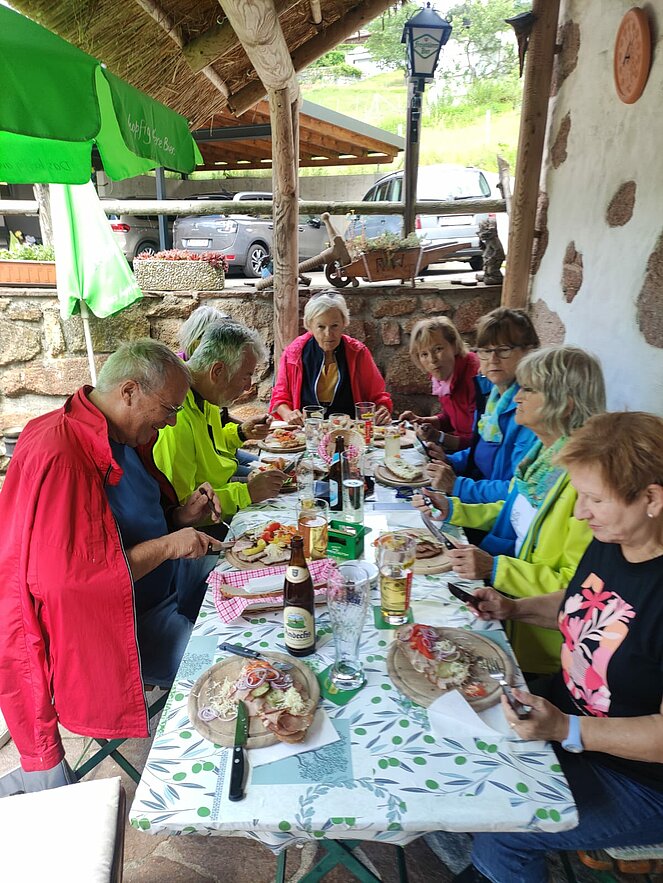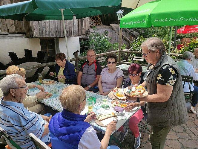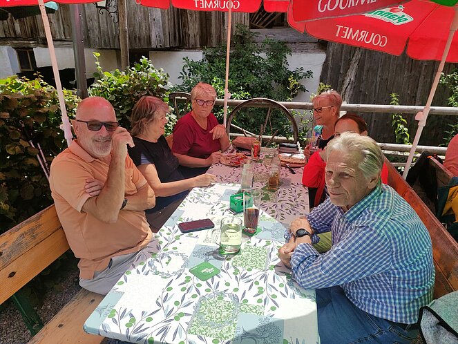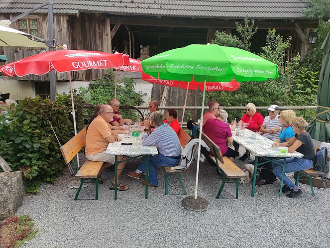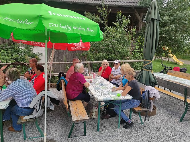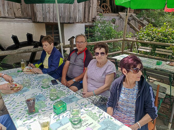 16 Wanderfreudige gingen zu Fuß zur Weiglmühle. Einige fuhren mit dem Rad und die aus gesundheitlichen Gründen die Strecke nicht mehr schafften, taten sich zu Fahrgemeinschaften zusammen und fuhren mit dem Auto. Es waren immerhin knapp 12 km zu gehen und der Weg führte uns durch Siedlungsgebiet mit sehr schönen Häusern und Gärten, sowie auf Wald- und Wiesenwegen. Die Weiglmühle liegt idyllisch an der kleinen Gusen, beherbergt ein Mühlenmuseum mit Einrichtungen, welche teilweise über 100 Jahre alt und in ihrem Originalzustand erhalten sind. Hier konnten alle ihren Durst stillen und sich stärken, um den Rückweg nach einer längeren Rast, wieder frisch und munter anzutreten. Die Stimmung war wie immer sehr gut unter den Mitgliedern und alle hatten Spaß.