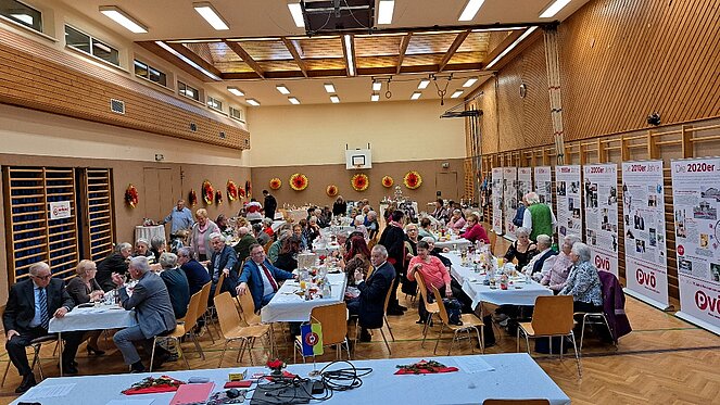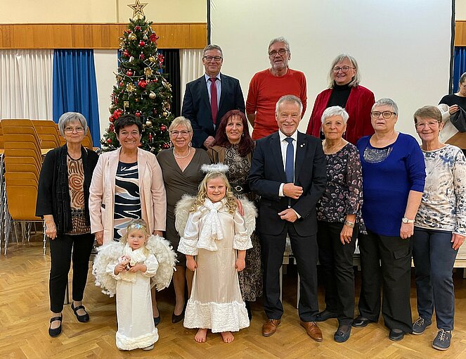 Der Ortsvorsitzende Herbert Porsch freute sich sehr über mehr als 100 Gäste, die seiner Einladung gefolgt waren. Unter diesen begrüßte er besonders Landespräs.Prof.Dr.Hannes Bauer und Gen.sekr.Andreas Wohlmuth, die ausführlich und interessant über die vergangenen Jahrzehnte des Pensionistenverbandes referierten. Der PVÖ feierte ja das 75Jahr-Jubiläum, daher fand eine kleine Ausstellung darüber statt. Unter den Ehrengästen waren auch LAbg.René Zonschits, GR Michael Mann und GR Thomas Wagner, die die Veranstaltung gerne besuchten. Einige künstlerisch begabte Pensionisten stellten ihre Bastelarbeiten und Handarbeiten aus. Nach dem feierlichen Programm mit weihnachtlichen Gedichten und Liedern traten auch die Kleinsten als Weihnachtswichtel auf. Das "Christkind" Caroline mit ihrem kleinen Engerl Marlene teilten kleine Geschenke der Kinderfreunde aus. Jeder Gast durfte sich über ein Gratis-Los freuen und bekam einen Tombola-Treffer überreicht.