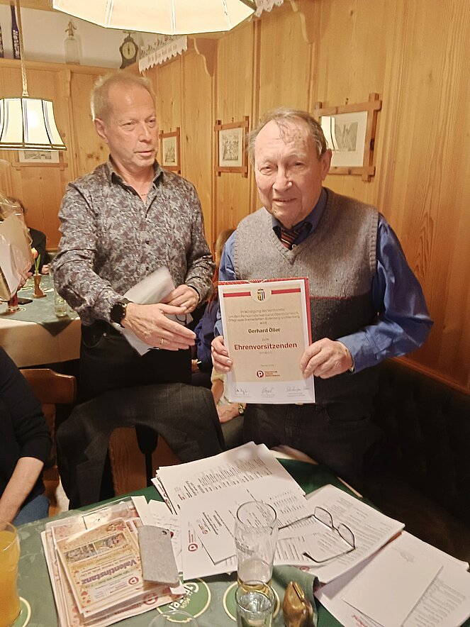Die erste Amtshandlung des neuen Obmannes war die Überreichung der Urkunde an Gerhard Öller zum Ehrenobmann.
