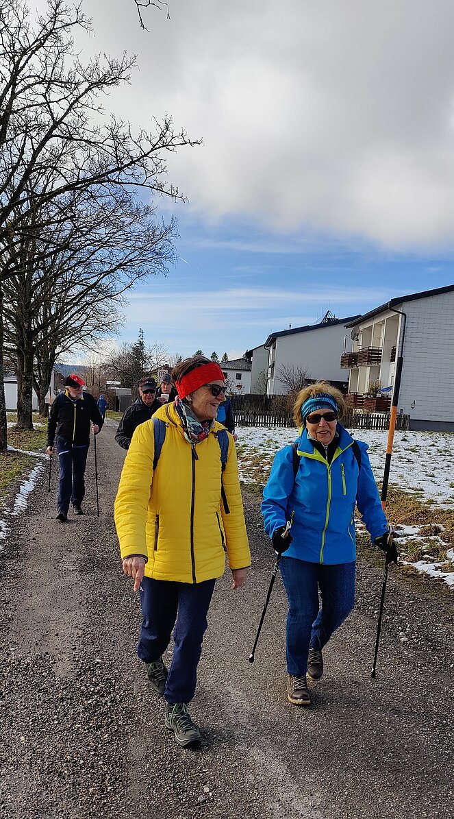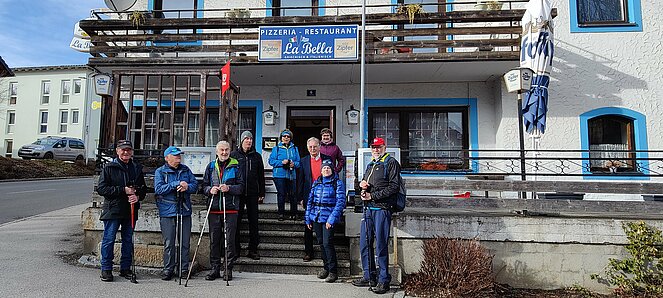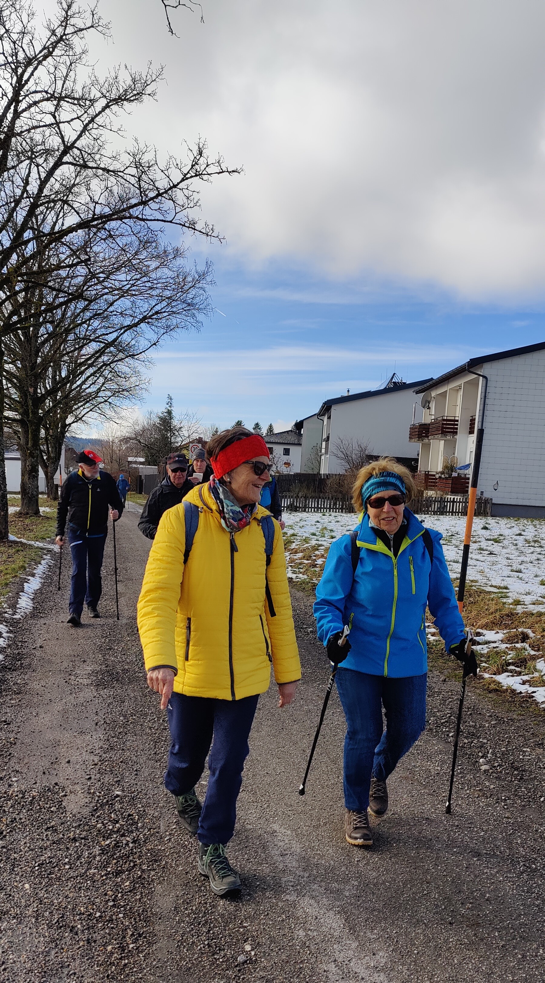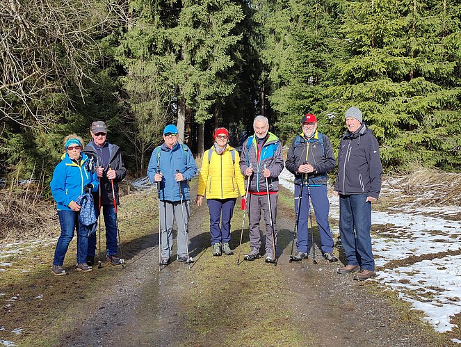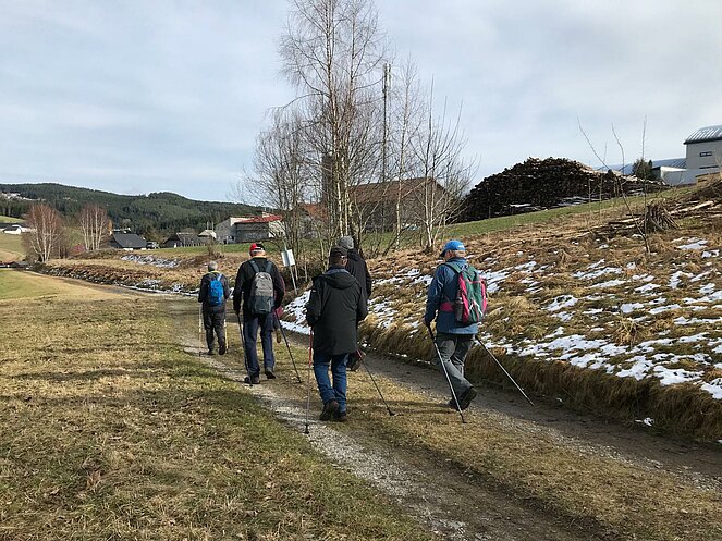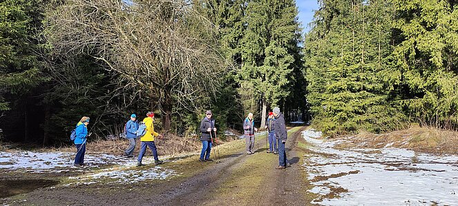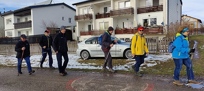 Neun Personen wanderten am 24. Februar 2024 bei Sonnenschein auf teilweise verschneiten Wegen von Hellmonsödt nach Reichenau.