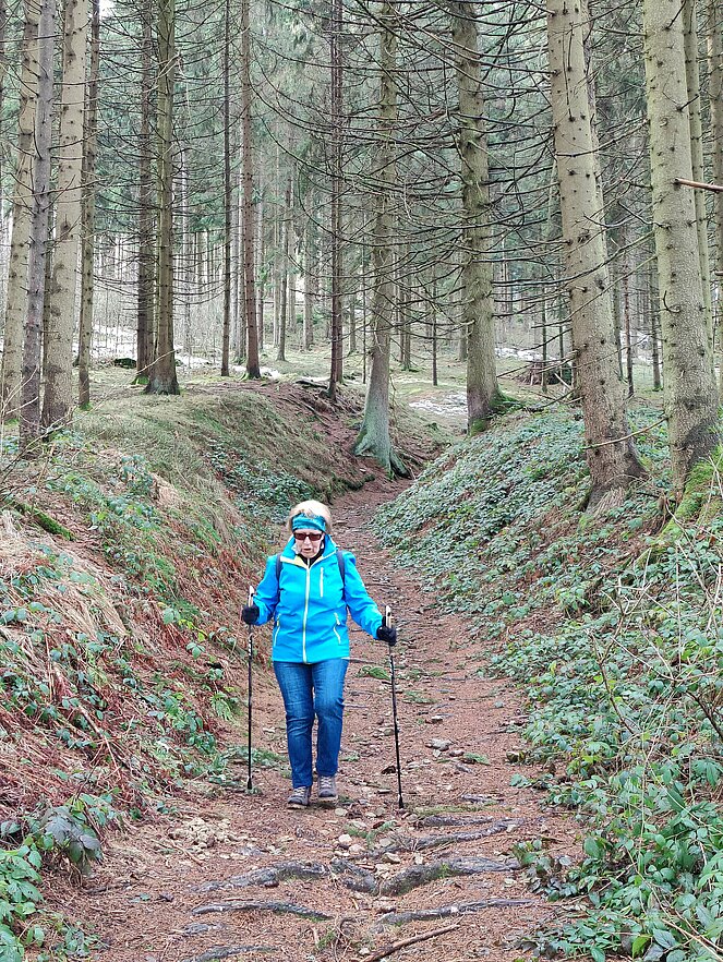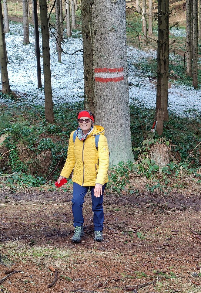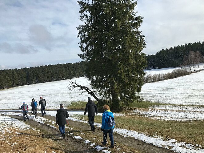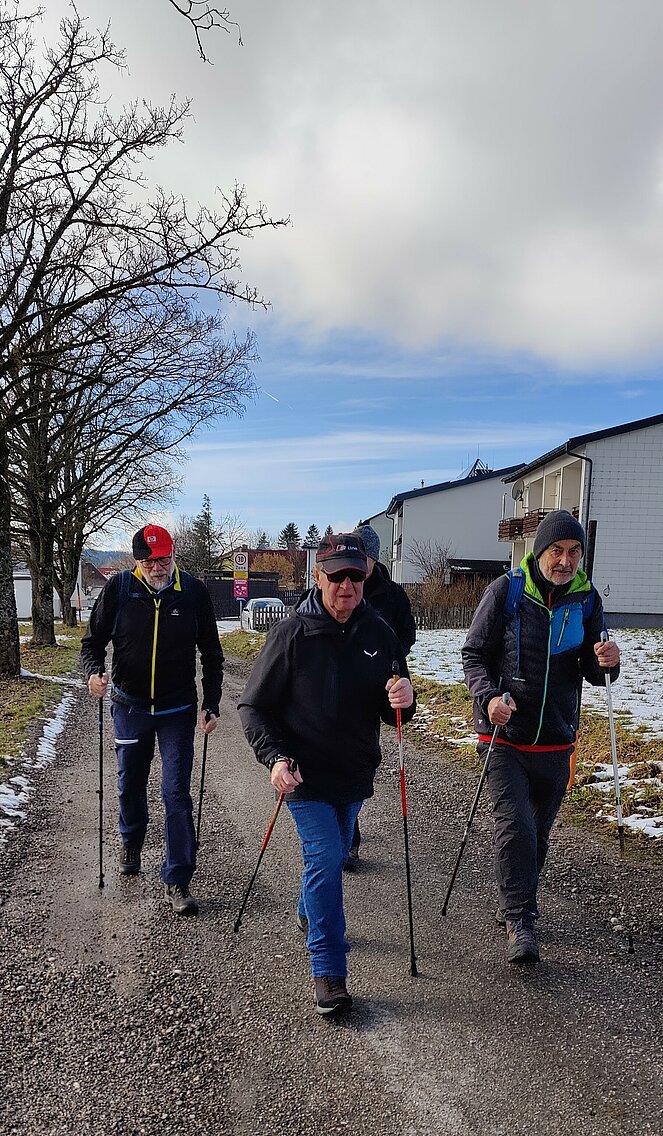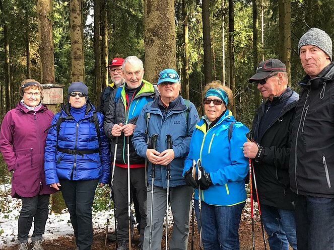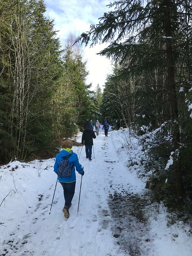 Neun Personen wanderten am 24. Februar 2024 bei Sonnenschein auf teilweise verschneiten Wegen von Hellmonsödt nach Reichenau.