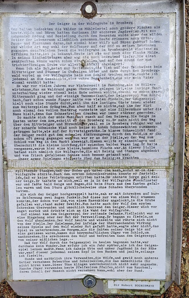 Über Eckartsbrunn gings beim Hausl vorbei und weiter zur Wolfsgrube, wo ein Geiger nächtens auf dem Heimweg hineinfiel und von einem Wolf umzingelt war. Sein Geigenspiel bis zum Morgen rettete ihn. Die Jäger erschossen den Wolf und befreiten den Geigerseppl aus der Grube.