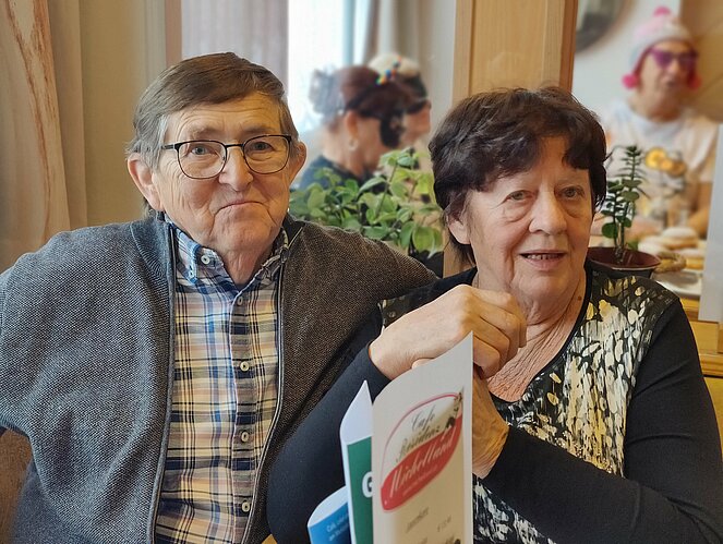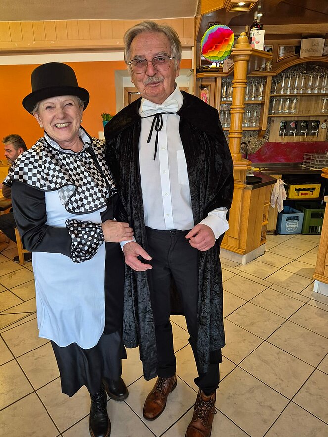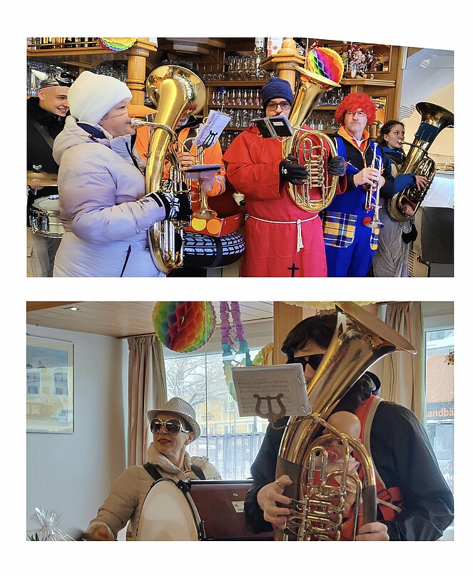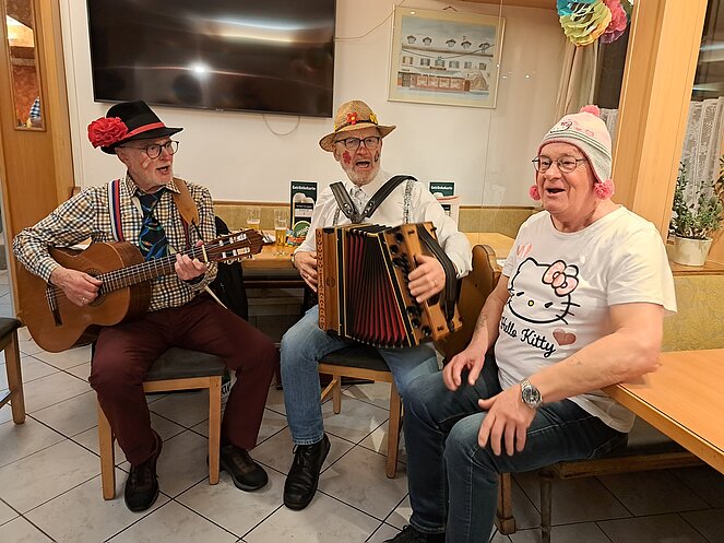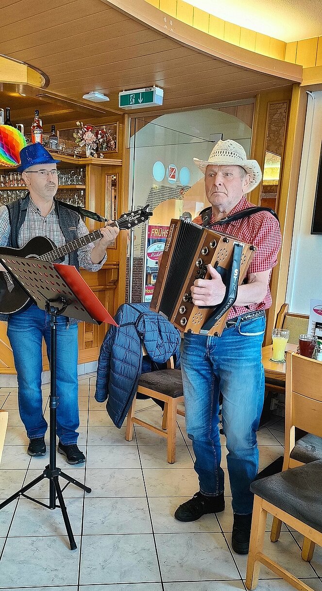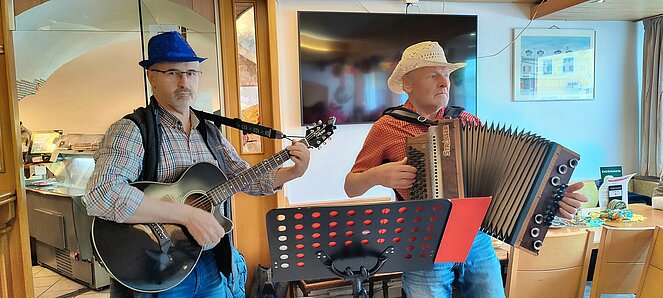 Für beste Stimmung und einen beschwingten Nachmittag sorgten Hans auf seiner Steirischen und Franz an der Gitarre. Zusätzlichen Schwung brachten Musikgruppen, die während ihres Umzugs im Markt auch im Cafe Bauer einkehrten und die Gäste musikalisch begeisterten.