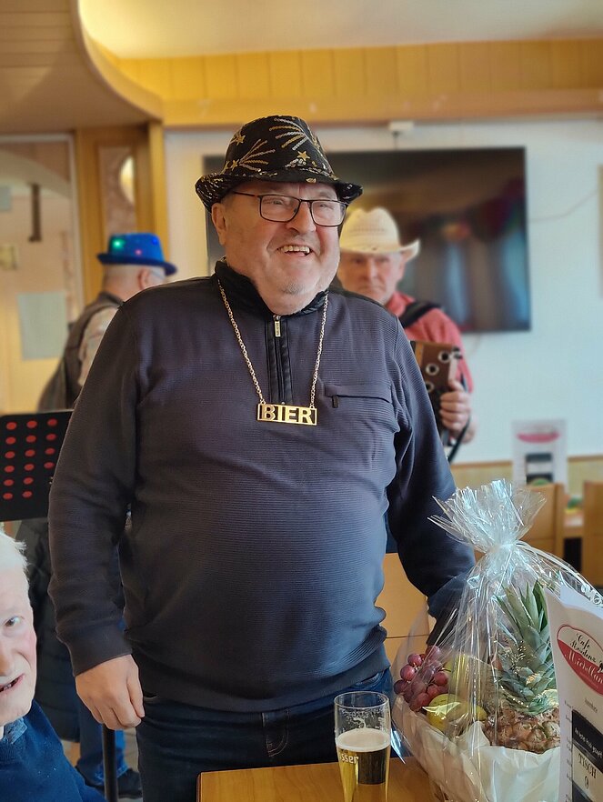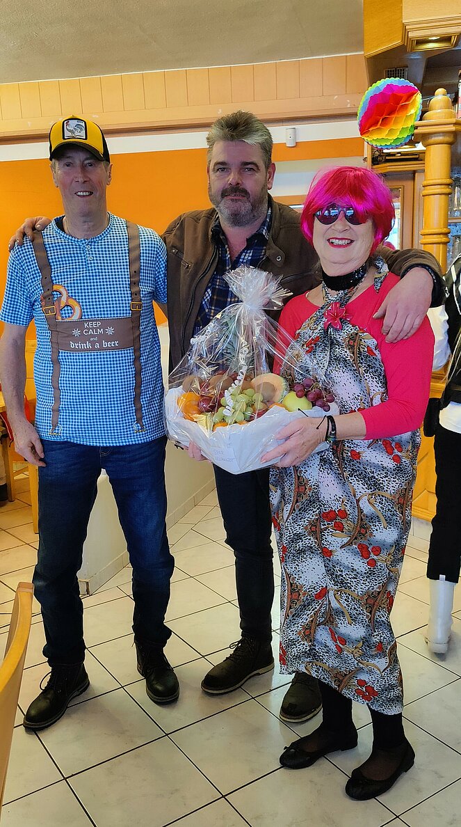 Vorsitzender Werner sicherte sich mit seiner gewinnbringenden Karte den Zuschlag für den riesigen Obstkorb (gespendet von der Fa. SPAR). Er ließ diesen uneigennützig versteigern. Das Höchstgebot gab Stammtisch-Gast Stefan ab.