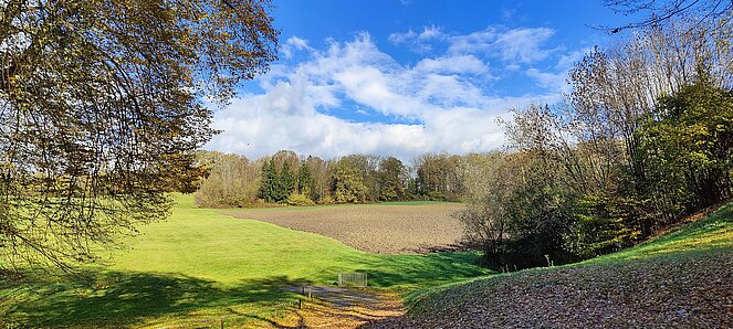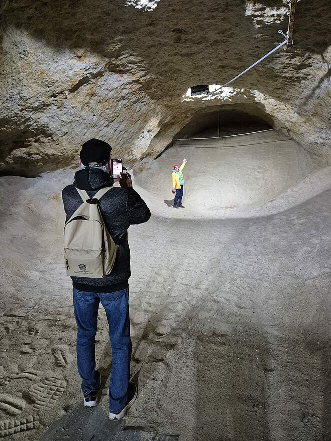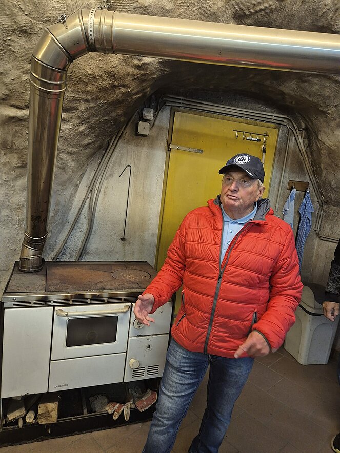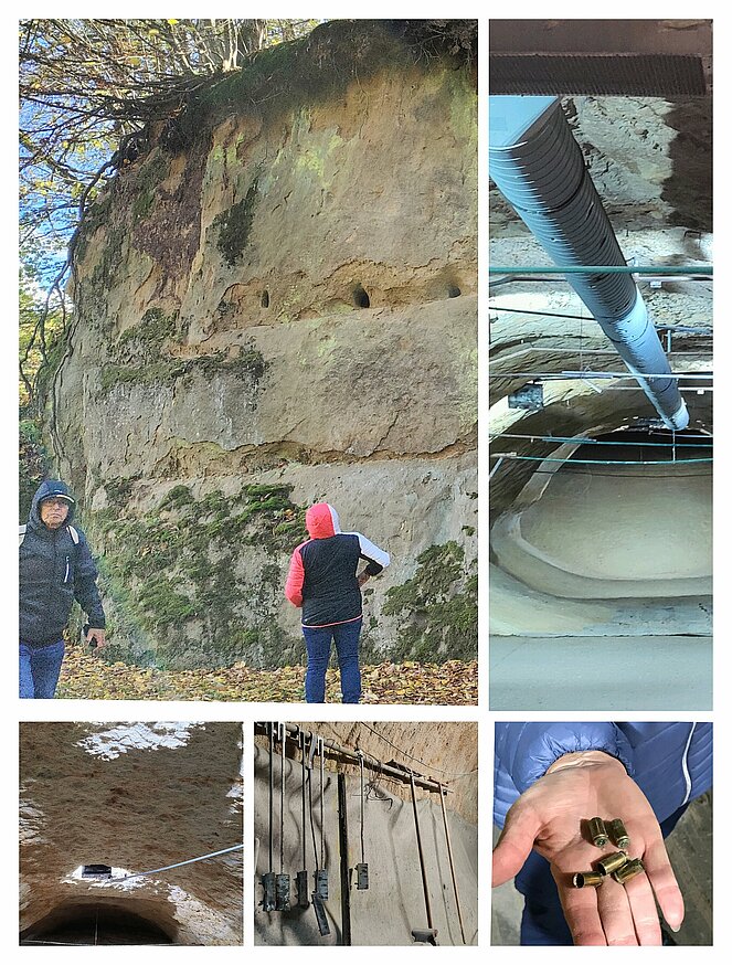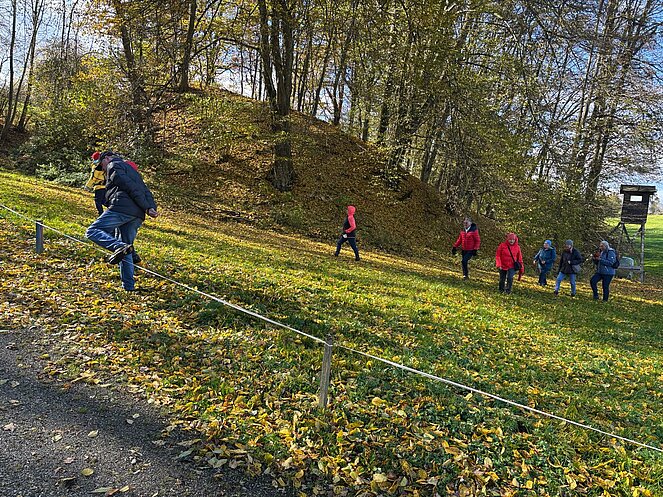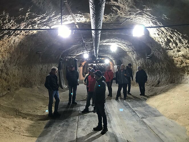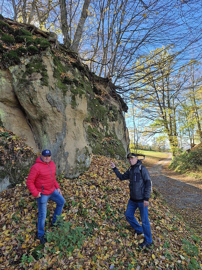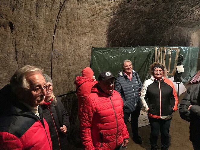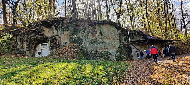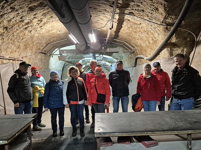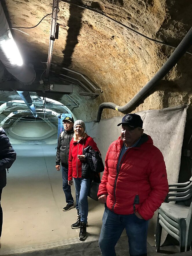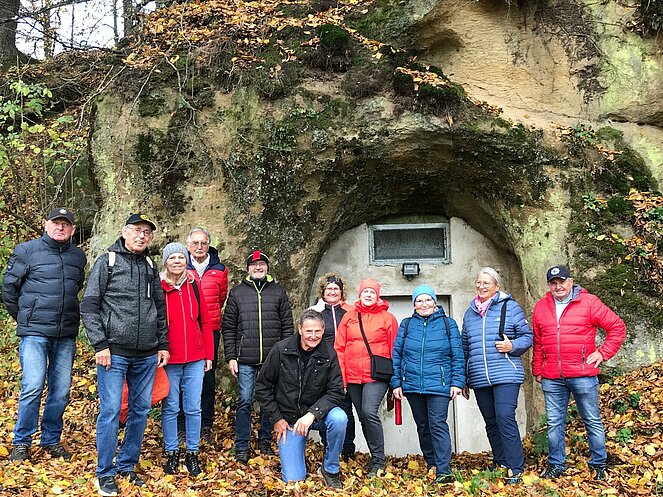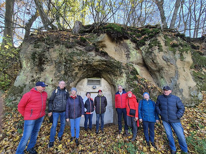 Elf Personen fuhren bei der Oktoberwanderung in Fahrgemeinschaften nach Ruhstetten, Gemeinde Katsdorf, dem Heimatort unserer Wanderführerin Traudi. Vom Mostheurigen Deisingerhof wanderten wir bei etwas stürmischem Herbstwind und uns umwirbelnden Blättern an Streuobstbäumen vorbei zur Siedlung Weidegut. Den Wiesenweg entlang hatten wir einen traumhaften Weitblick nach Katsdorf. Angelangt bei den Wurmthaler Sandkellern erzählte uns der Besitzer Franz Hintersteininger von deren Entstehung. Der Sand wurde mühsam händisch abgebaut. Da es nirgends Sandgruben gab, wurden einige Rieder Häuser mit diesem Sand erbaut. Der größere Keller hat eine konstante Temperatur von 8 Grad und wird jetzt von Sportschützen zum Schießen genützt. Der Mostkeller, in dem früher auch Obst und Gemüse gelagert war, wird nicht mehr genützt.