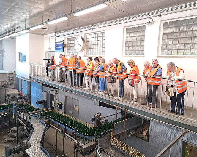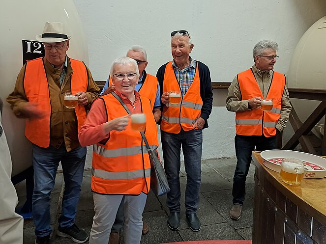 Mit orangen Warnwesten bekleidet starteten wir unsere Tour bei einem alten Bierfuhrwerk. Über das Lager, auf dem unzählige Bierkisten gestapelt waren, gingen wir zum Sudhaus, dem Herz der Brauerei. Anhand einer Zeichnung (sh. Foto) wurde uns die Bierproduktion erklärt. Bis zur Verkostung im 2 Grad kalten Keller dauerte es nicht lange. Uns wurde ein perfekt gezapftes Bier mit einer Krone aus dichtem Schaum serviert. Dann gings weiter durch eine riesige Halle, in der wir von oben die Reinigung, Abfüllung, Etikettierung und Verpackung zum Versand der Flaschen verfolgen konnten – alles automatisch. Natürlich konnten wir Bier und dazugehörige Gläser käuflich erwerben.