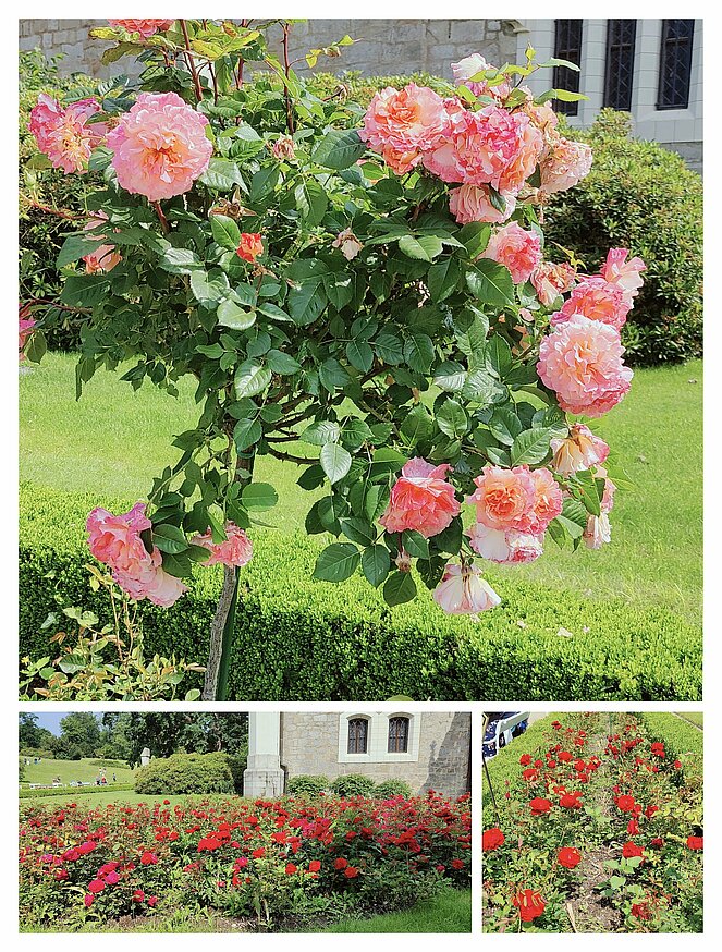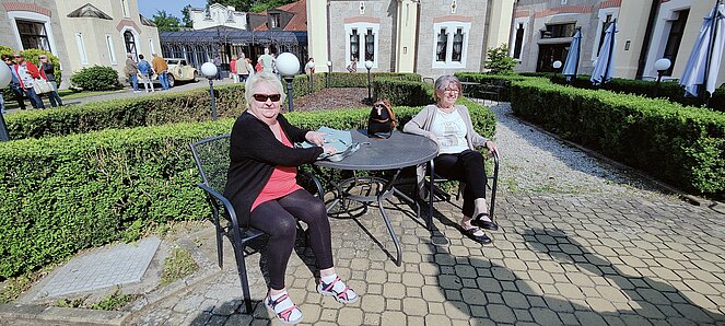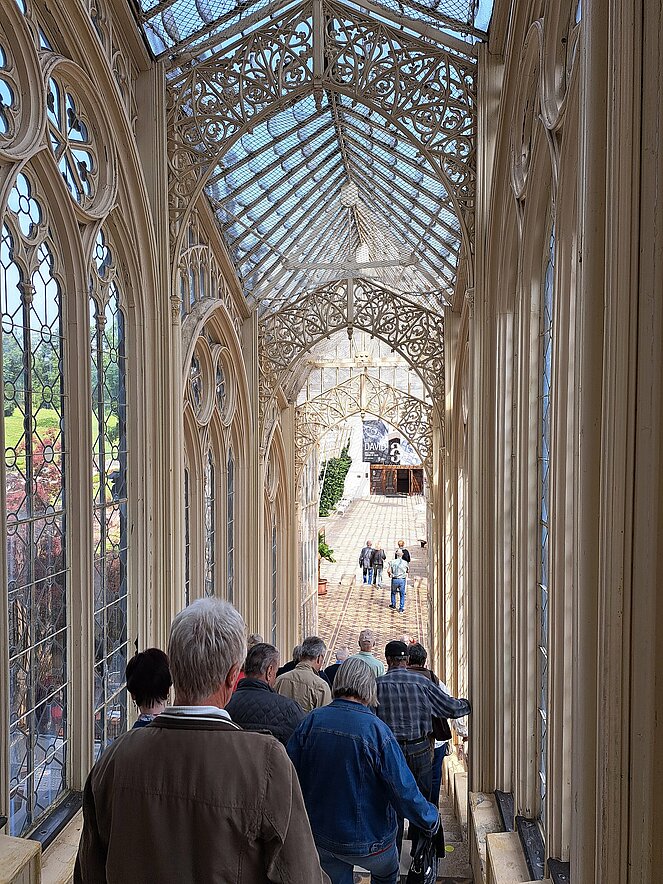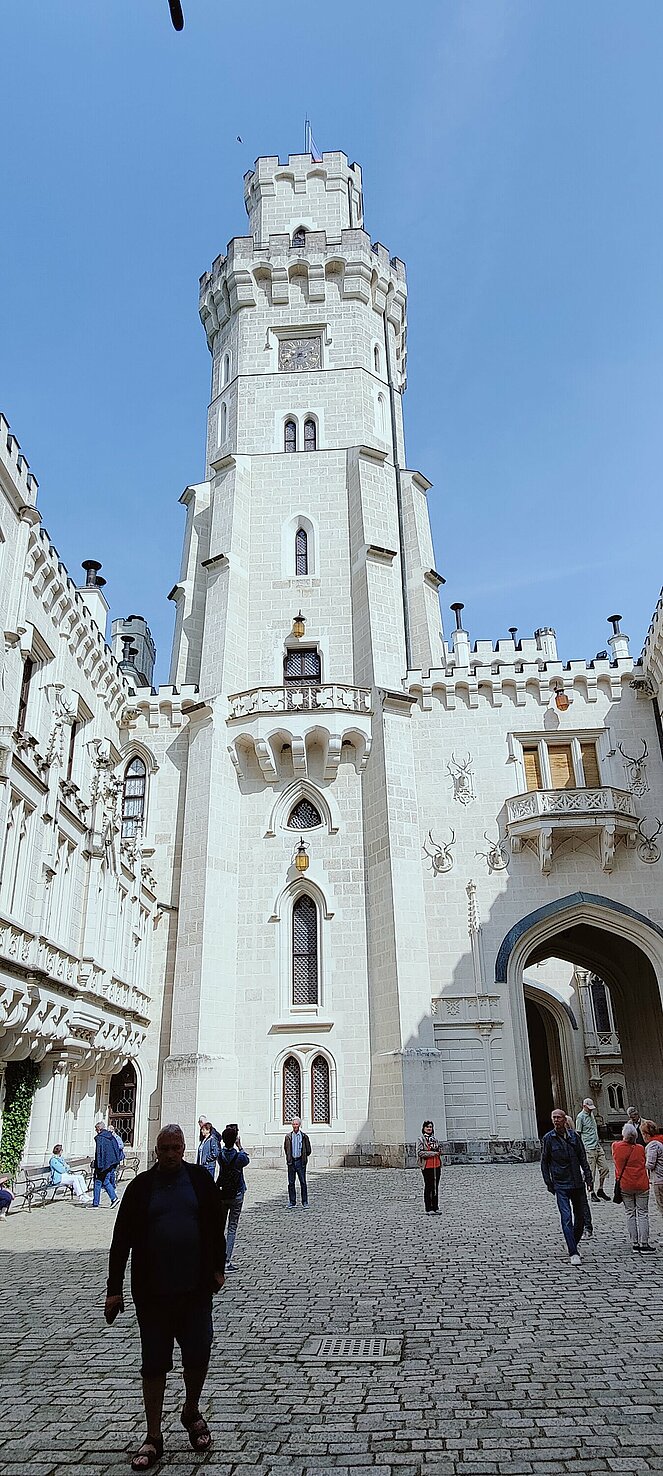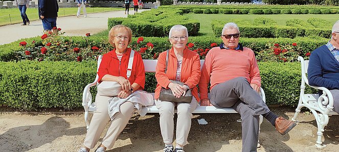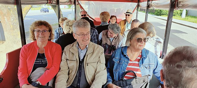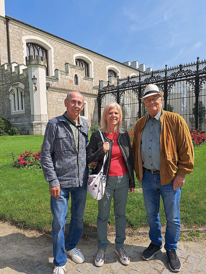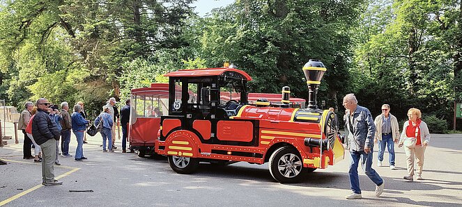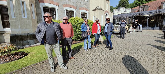 30 Mitglieder fuhren mit einem Bus der Firma Lengauer über Bad Leonfelden, Studanky, Vyssi Brod und Krumau nach Hluboká (deutsch Frauenberg). Dort erwartete uns ein Bummelzug, der uns den steilen Fußweg zum Schloss ersparte. Da wir noch etwas Zeit bis zu unserer Führung hatten, verbrachten wir diese im Garten des angrenzenden Hotels.