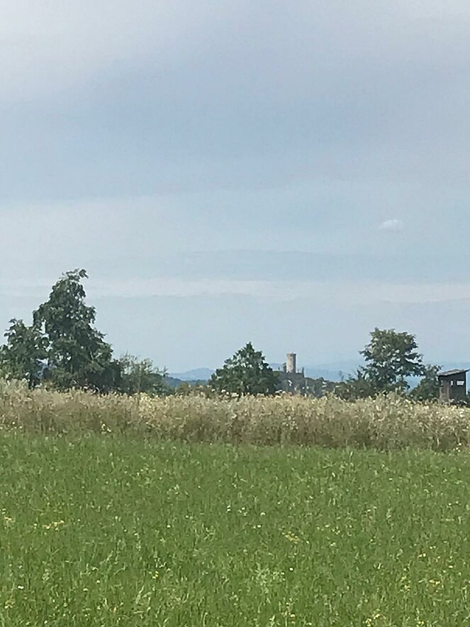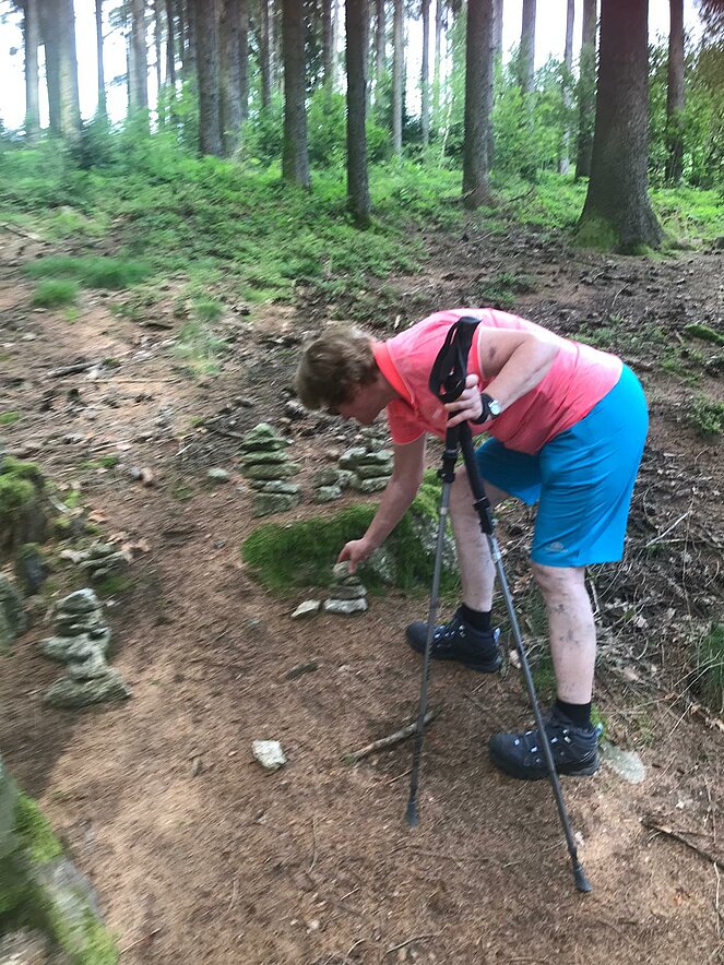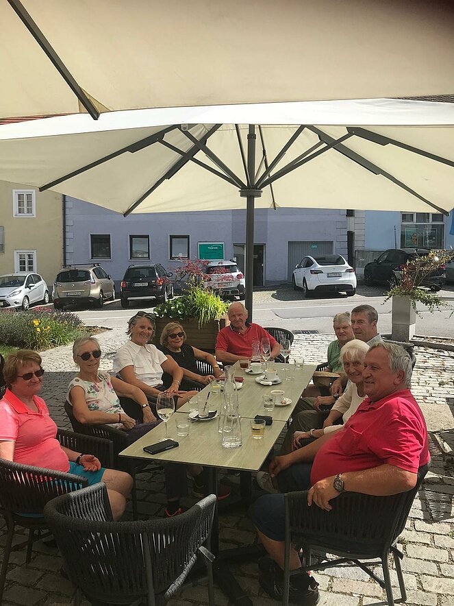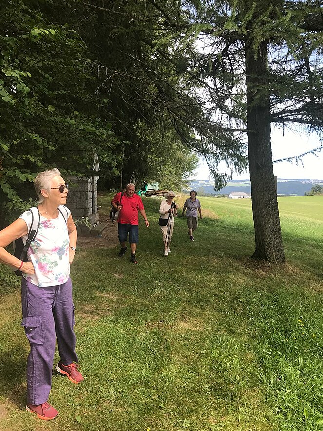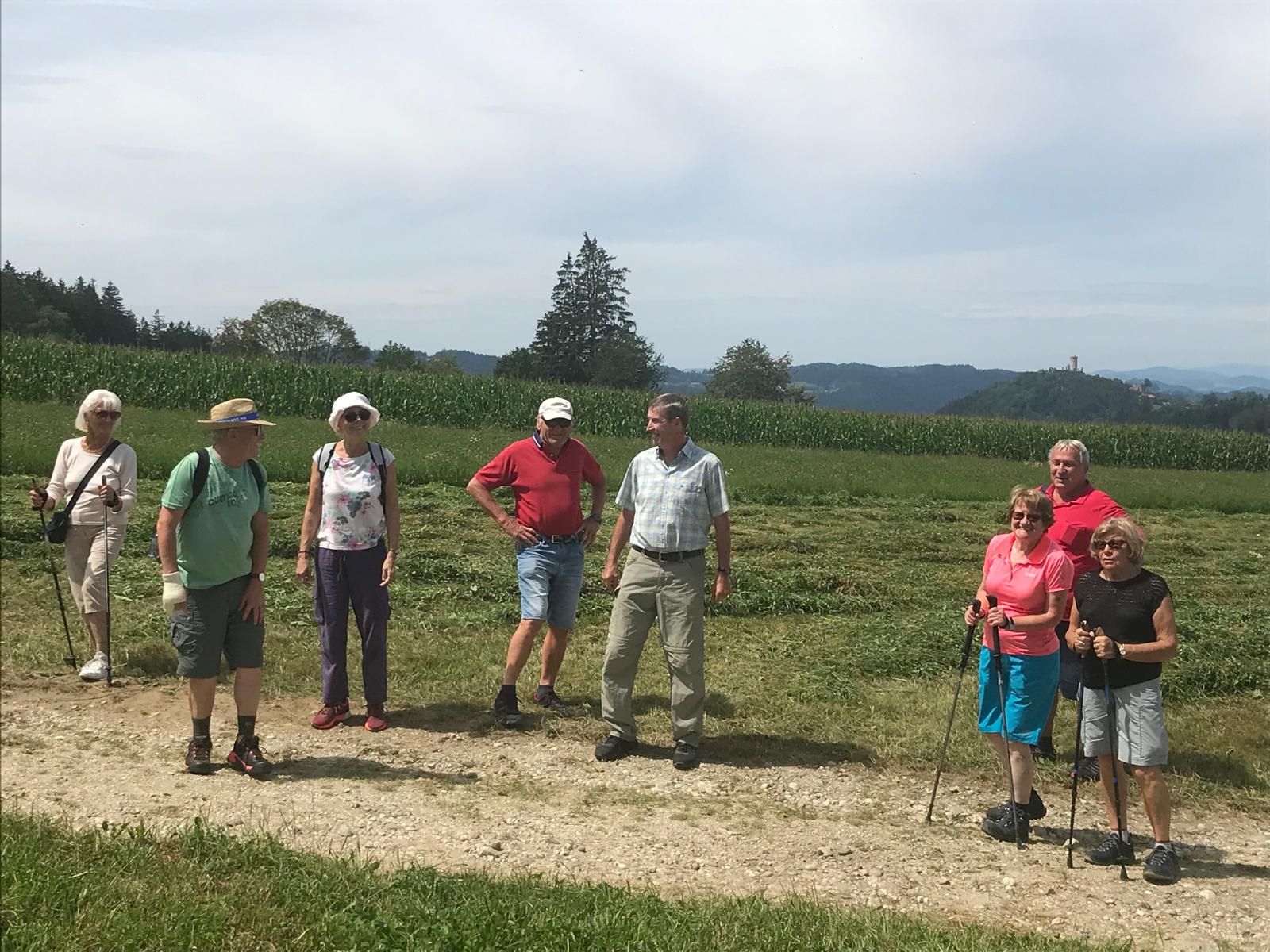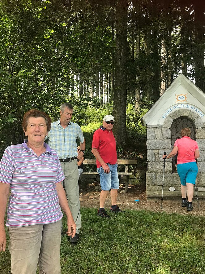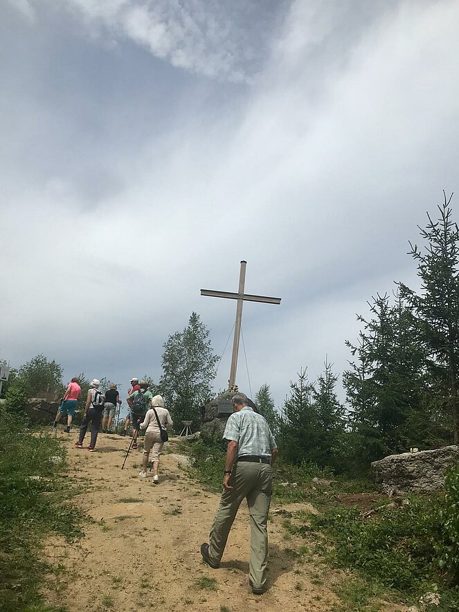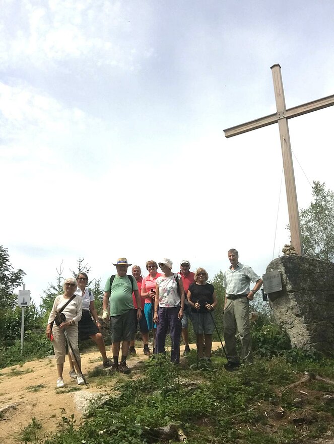 Unsere Juliwanderung machten wir in Oberneukirchen. Neun Personen gingen die kleine Bergrunde und zum Bergkreuz mit. Zuerst gings leicht bergauf, dann eben bis zum ersten Rastplatz vom Schnopfhagen Liederweg. Einmal im Wald rundum und auf halbem Weg zum Bergkreuz, welches auf einer Höhe von 868 m, dem höchsten Punkt von Oberneukirchen, im Jahr 2023 errichtet wurde. Vor langer Zeit stand hier ein Aussichtsturm. Das Kreuz wurde statt des Turms errichtet. Bei der Marienkapelle folgte noch eine Rast, bevor dann auf dem Waldweg der Berg vollständig umrundet wurde. Nach 5,5 km kehrten wir abschließend im Cafe Manuel ein.