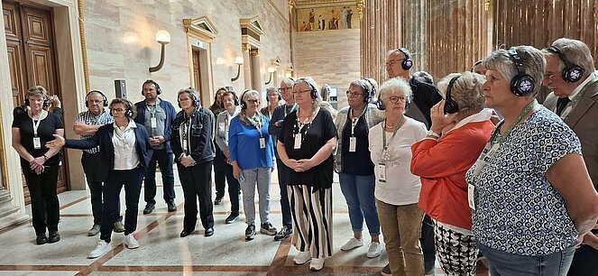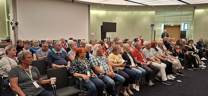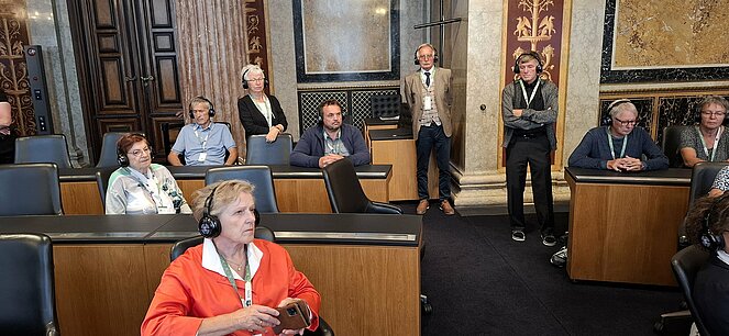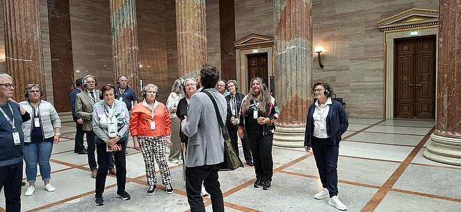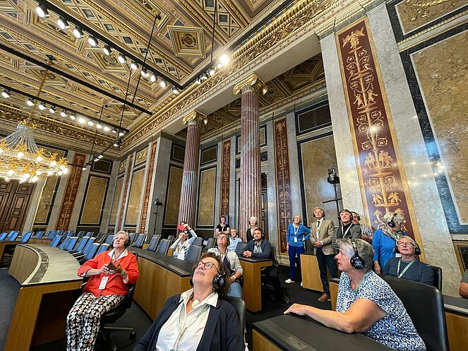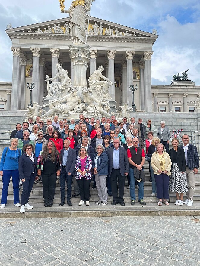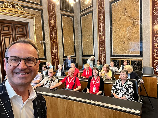 Am 9. Juli 2025 fuhren 56 Freundinnen und Freunde des Pensionistenverbandes nach Wien in unser Parlament – die Hochburg der Demokratie. Besonders freute uns die rege Teilnahme aus den verschiedensten Ortsgruppen – vielen Dank dafür. Nach einer kurzen Rast und Stärkung, trafen wir fast pünktlich beim Parlament ein. Dort wurden wir bereits von Bundesrat Dominik Reisinger und Nationalratsabgeordneter Sabine Schatz empfangen und herzlich begrüßt. Nach der Einschleusung teilten wir uns in zwei Gruppen. Vielen Dank an Dominik Reisinger, der sich die Zeit nahm und als Gruppenführer fungierte. Die andere Gruppe wurde von Herrn Stefan betreut. Besonders beeindruckend fanden wir den historischen Sitzungssaal der österreichischen Bundesversammlung, den Bundesratssaal, sowie den Sitzungssaal des Nationalrates.