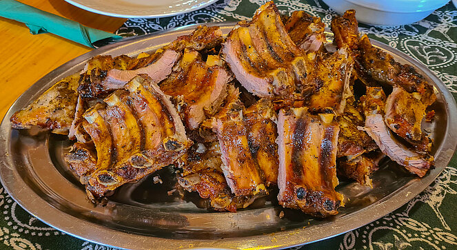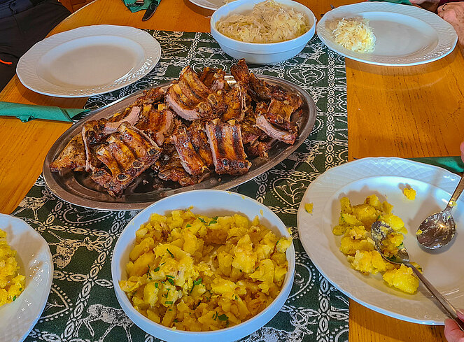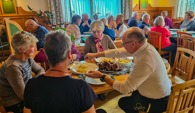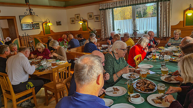 Dort warteten bereits 22 weitere PV-Mitglieder. Nach der Bestellung der Getränke wurden die köstlichen Ripperl mit Erdäpfelschmarren und Krautsalat serviert. Die Teilnehmer ließen sich das Essen schmecken und genossen danach noch Kaffee und Kuchen. Dabei wurde so manche Neuigkeit ausgetauscht, bevor es schließlich wieder zurück nach Ottensheim ging.