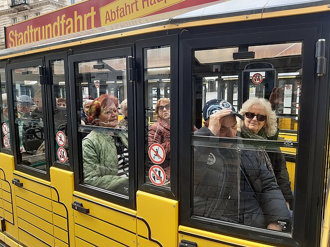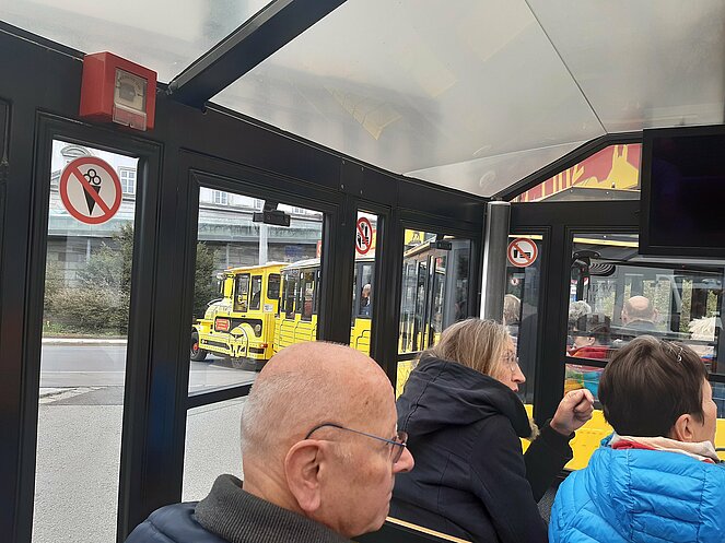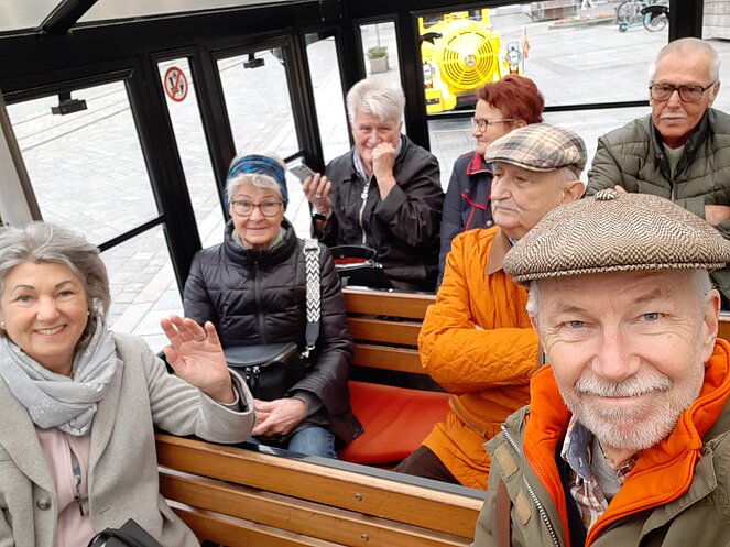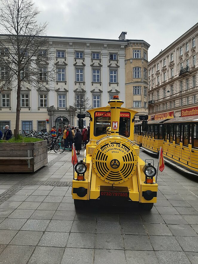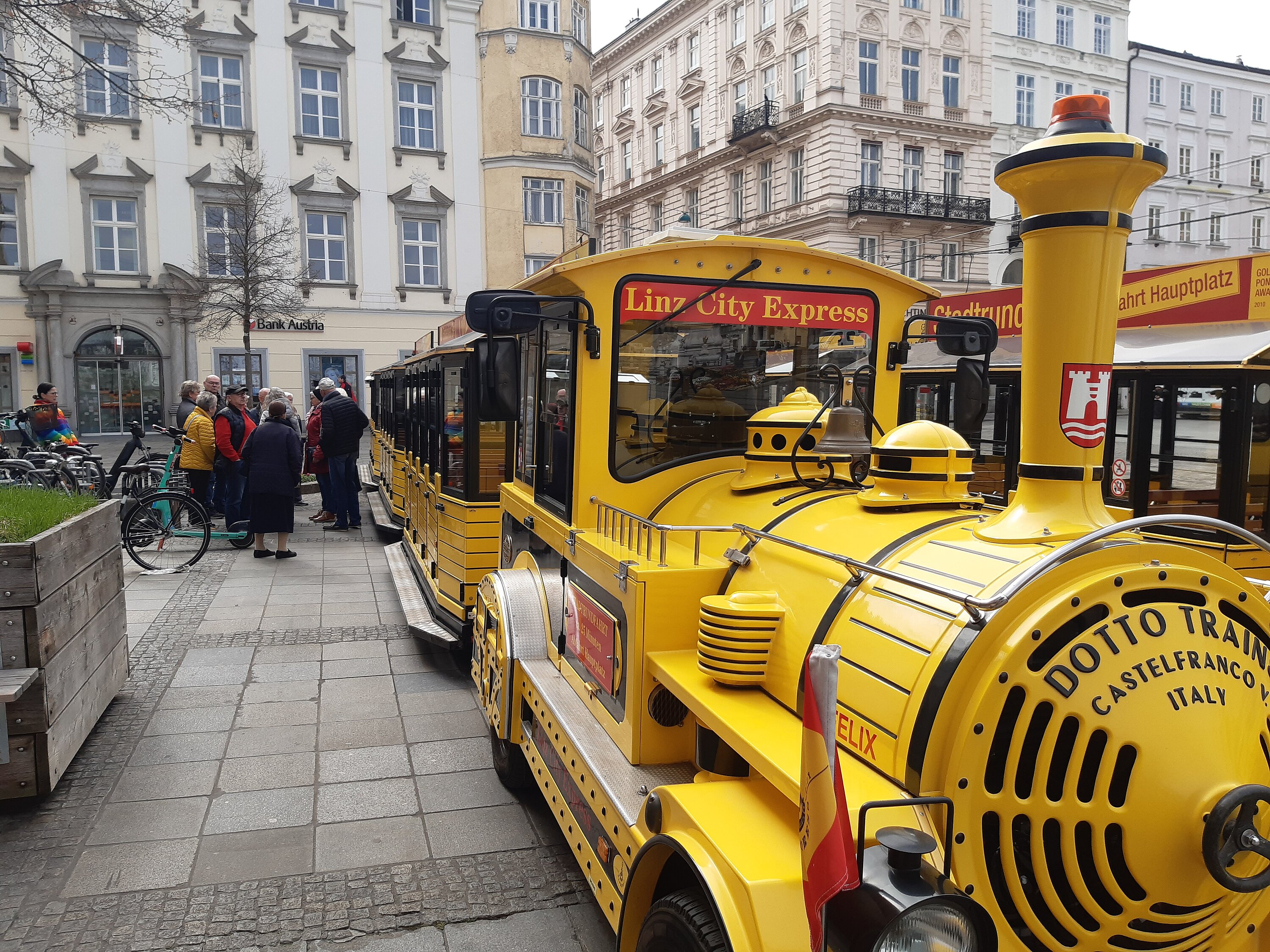Kulturreferent Kons. Peter Kronewitter hatte einen der gelben City-Express-Züge für eine Sonderfahrt gechartert. Der gelbe Zug führte die interessierten Senior*innen in mehr als einer Stunde auf einer speziell zusammengestellten Route durch die Linzer Innenstadt, vom Hauptplatz über die Donaulände, die Nibelungenbrücke, Alt-Urfahr und die Linzer Altstadt bis zum Bahnhofsviertel mit Wissensturm, Hauptbahnhof, Musiktheater, Arbeiterkammer und zurück über Mariendom, Taubenmarkt, Pfarrplatz, Alten Dom wieder zum Hauptplatz. Die Teilnehmer*innen verließen begeistert den Zug im Bewusstsein, obwohl zum Teil in Linz wohnhaft, wieder einige unbekannte Seiten und Details über unsere Landeshauptstadt gesehen und erfahren zu haben.