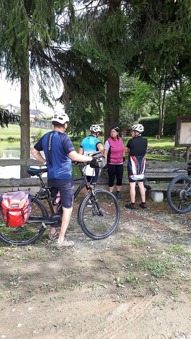 Summerau, Rainbach, Labach, Sonnberg, Sightseeing durch Freistadt, Lasberg, St.Oswald, Grünbach, Schlag, Lichtenau. Sepp gönnte uns ein paar erholsame Pausen bei idyllischen Plätzen. In Rainbach hielten wir unsere Rast im Gasthaus Blumauerhof ab und genossen in netter Runde ein feines Mittagessen. Frisch gestärkt fuhren wir retour nach Reichenthal. Heute erradelten wir stattlich 54km und 720 Höhenmeter. Vielen Dank an Pichler Sepp für die tolle Runde.
