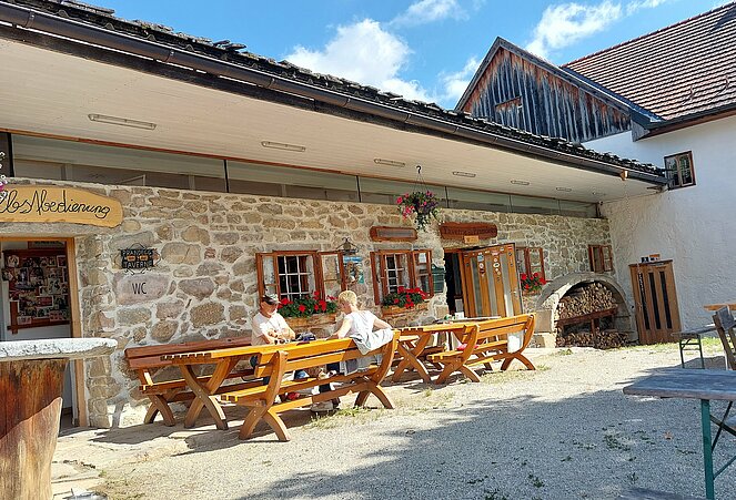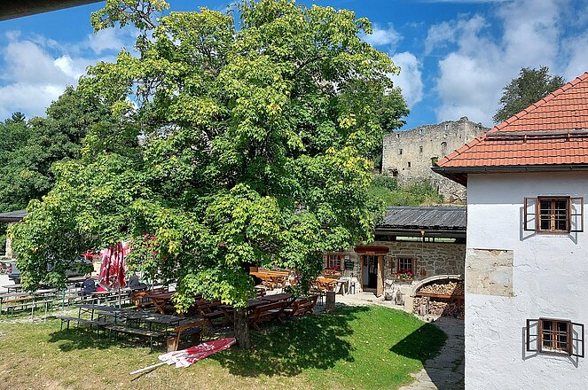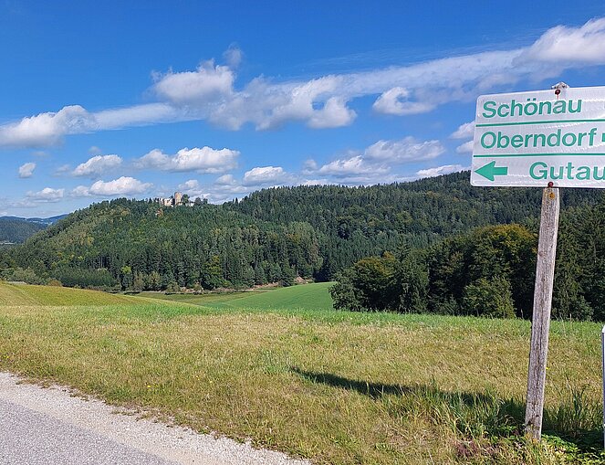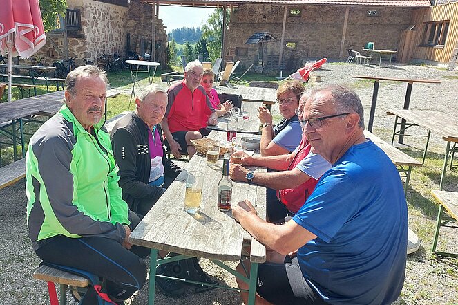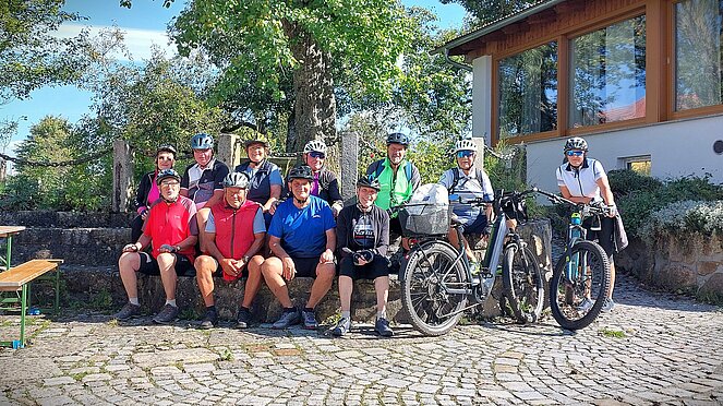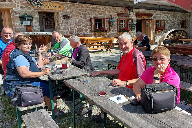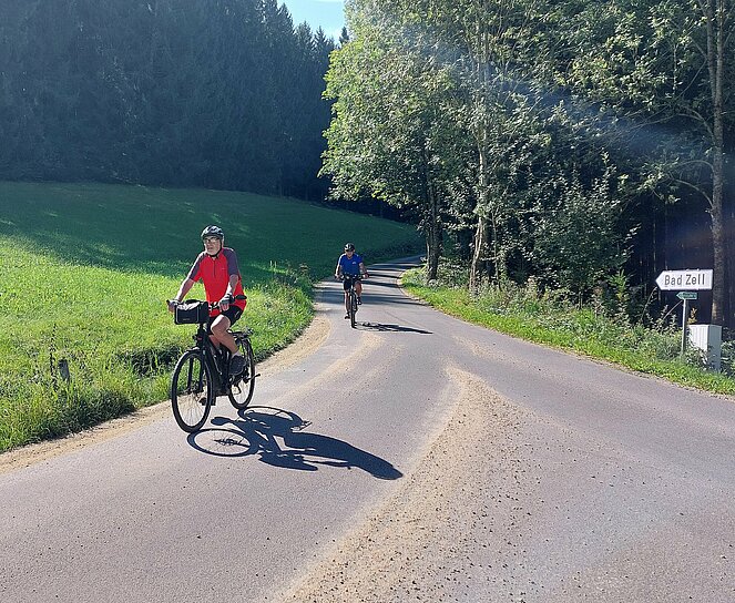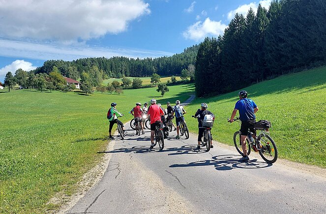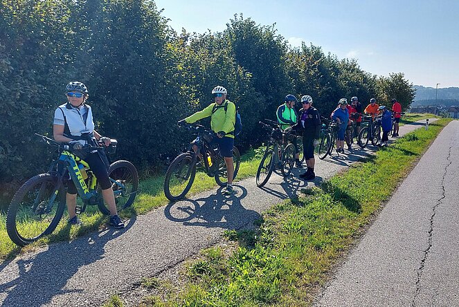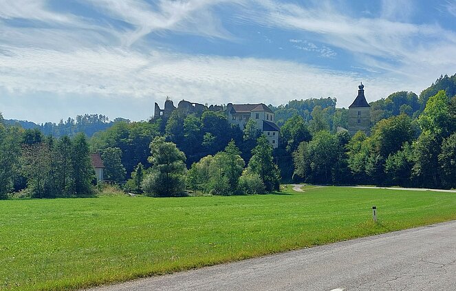 Steil bergab ging es nach der Mittagspause am Wanderweg hinunter ins Aisttal. Aber jeder von uns E-Bikern bestand diese Fahrprüfung. Umsomehr genossen wir dann eine 13 Kilometer lange Fahrt sanft entlang der Waldaist bis zur Burg Reichenstein. Nach einem kurzen Stück auf der stark befahrenen Bundesstraße erreichten wir wieder den Parkplatz der Fa. Haider.