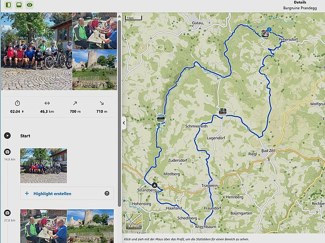 Ein schöner Spätsommertag war der 8. September. Wir trafen uns am Parkplatz der Fa. Haider ATB in Tragwein. Unser Ziel war die Ruine Prandegg, 46 km und 740 hm lagen vor uns. Gottfried Prenninger hat diese Ausfahrt organisiert und war unser Guide. Die ersten 28 Kilometer bis nach Prandegg ging es fast immer bergauf von Mistelberg – Haarland – Schedlberg – Kriechbaum – Fraundorf – Tragwein – Schmierreith – Erdleiten – Lanzendorf – Pehersdorf zur Ruine Prandegg, mal etwas steiler, mal sanft steigend. Angenehm war es dann im sonnigen Gastgarten bei der Taverne in Prandegg die Mittagsrast einzulegen. Nach der Stärkung bestand die Möglichkeit noch eine kurze Wanderung zur Burg hinauf zu unternehmen. Die dazu keine Lust hatten genossen bei einem Kaffee noch die Pause.