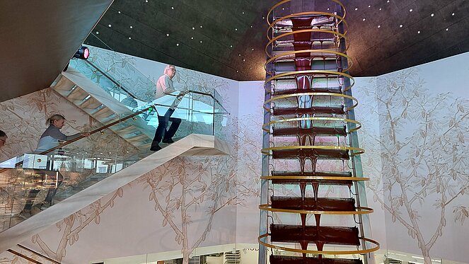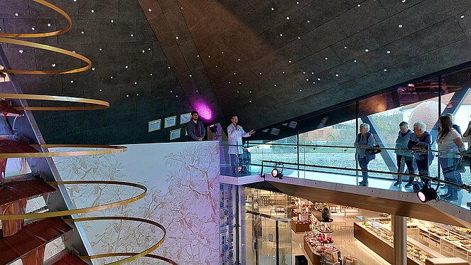 Nach dieser Stärkung ging es weiter nach Allhaming zur Confiserie Wenschitz. Dort empfing uns Helmut Wenschitz, Bäcker- und Konditormeister und Gründer des Betriebs, persönlich. Vor 35 Jahren startete er mit seiner Firma – und heute ist sie ein Begriff für höchste Qualität und handgefertigte süße Köstlichkeiten. Besonders beeindruckend: Die Kakaobohnen kommen teilweise direkt von Fair-Trade-Bauern, die Helmut Wenschitz direkt besucht und bezahlt , alles wird mit sehr viel Liebe zum Detail verarbeitet. Ein absolutes Highlight ist der 12 Meter hohe Schokobrunnen, der den ganzen Tag über mit flüssigem Kakao gefüllt ist – und wer Lust hat, darf Helmut Wenschitz sogar beim Reinigen helfen! Dieser Brunnen steht auch im Guiness Buch der Rekorde.